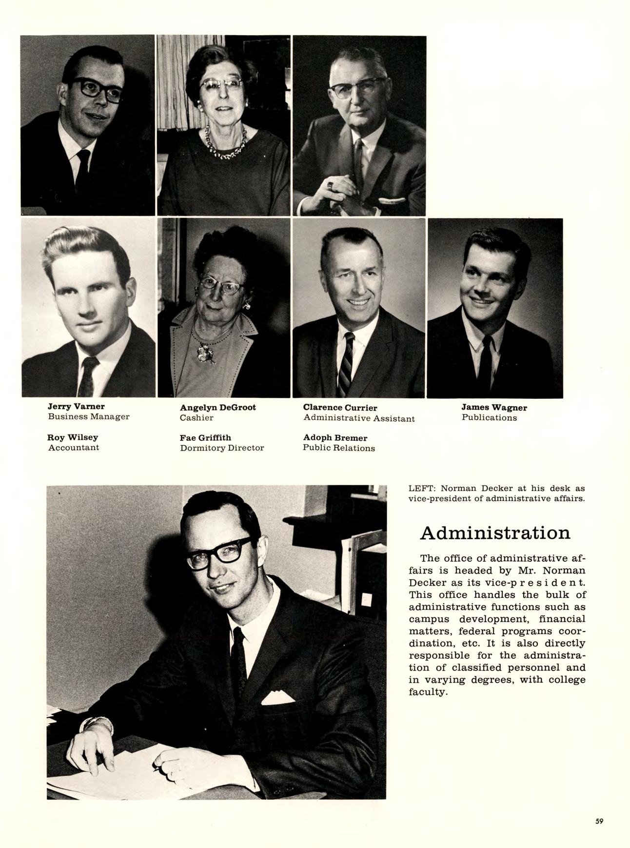 Heading the office of academic affairsfor the administration is Dr. Donald Warner, Vice-President ofAcademic Affairs. He is responsible for the administration of the academic program and all academic matters are referred to him and his deans; Dean of Arts and Sciences, Dr.Dan Willson; Dean of Education, Dr. Frank W. Markus; andDean of Graduate Studies, Dr. Frank L. Van Alstine.
