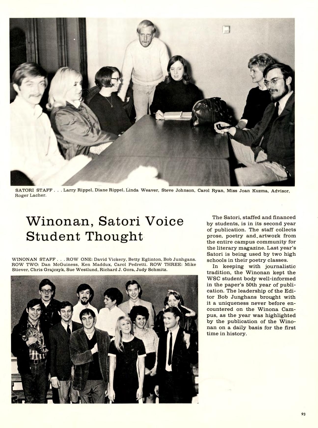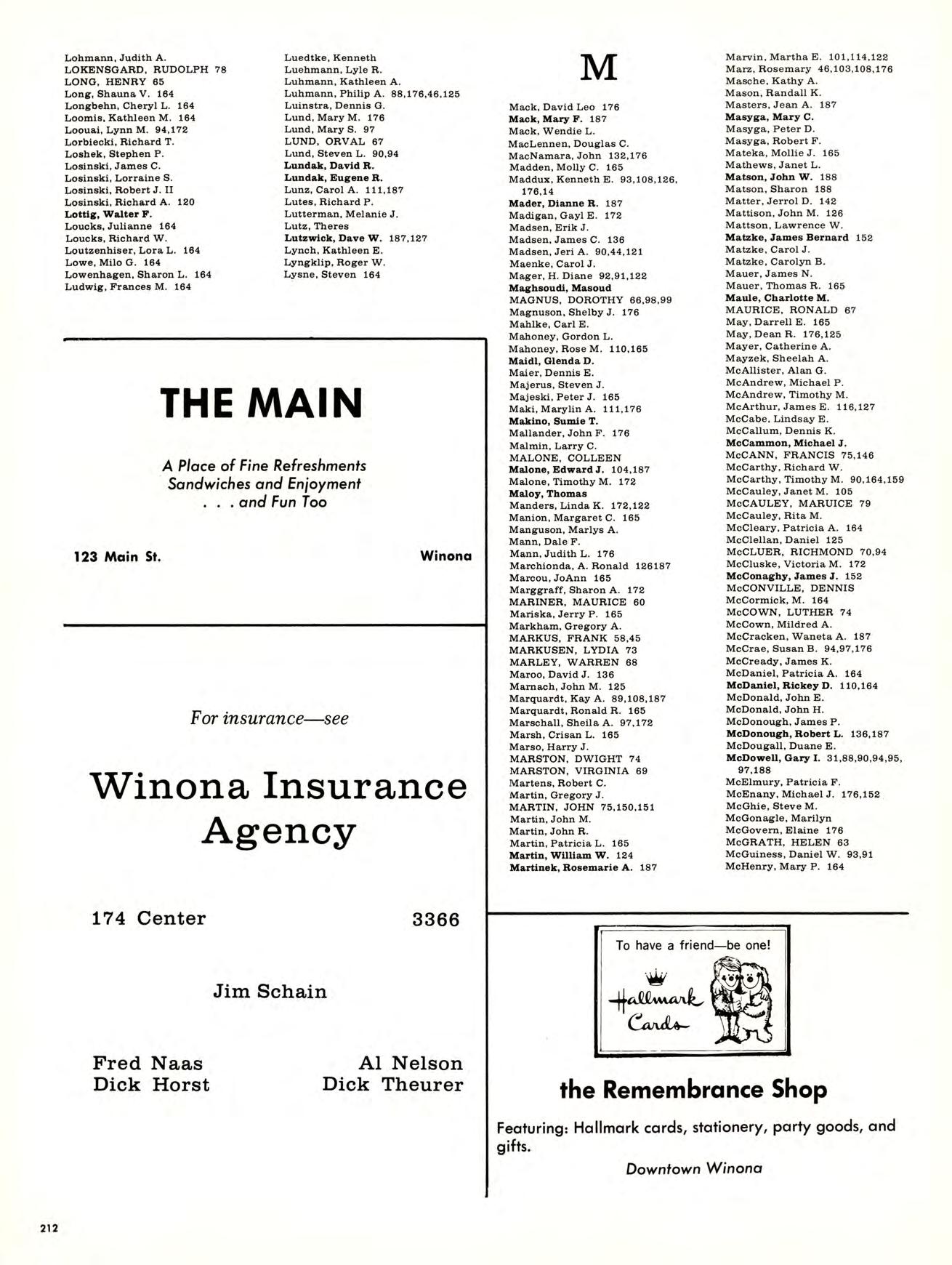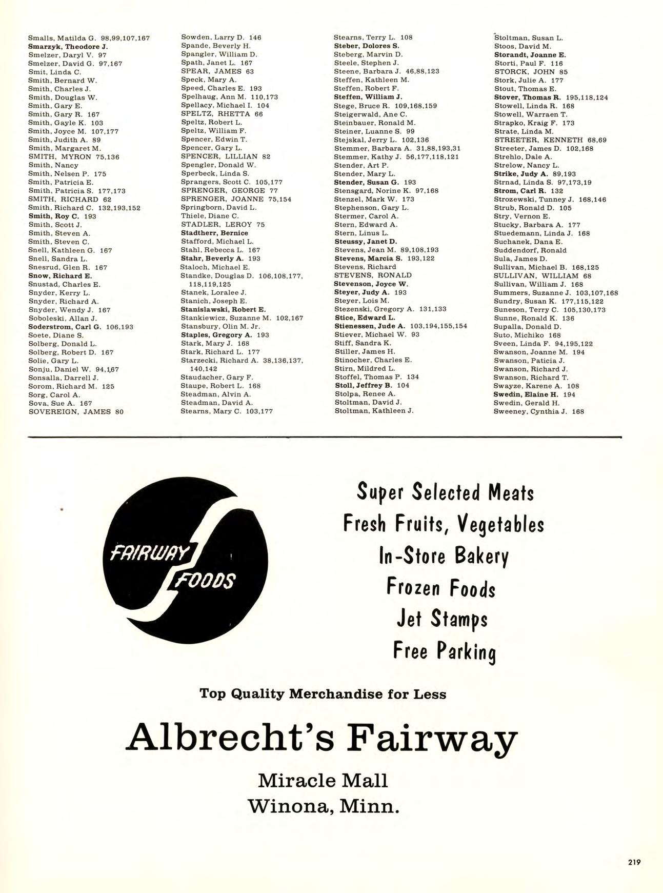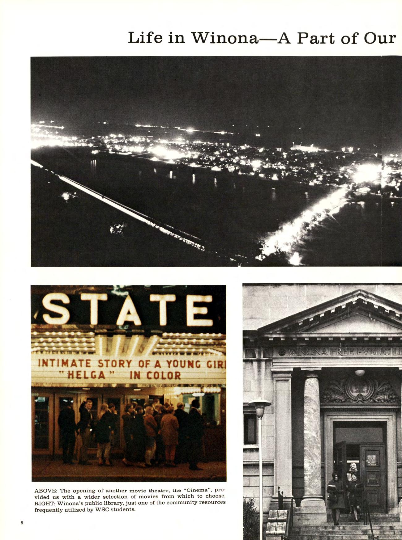 Is best viewed from the top of Garvin Heights. From that impressive height Can be seen all of Winona, which is, For most of us, not just another Town but the Place where we work, worship. Spend money. Get educated, have fun, and Become involved. Whether it be as a Y-team advisor, A disc-jockey At a local radio station. Or a clerk in a store. And because we live here, taking Karate at the YMCA, Curling up in a big leather chair At the public library And never getting a ro u nd to study, Having a good time At Shakey’s and the Pizza Hut, And going into debt With that charge account at Stevensons, are all Things that become a part of our College experience.