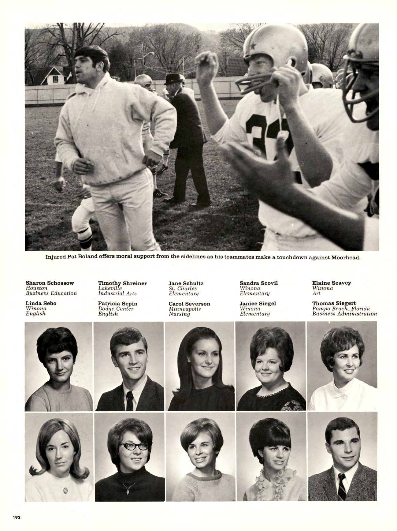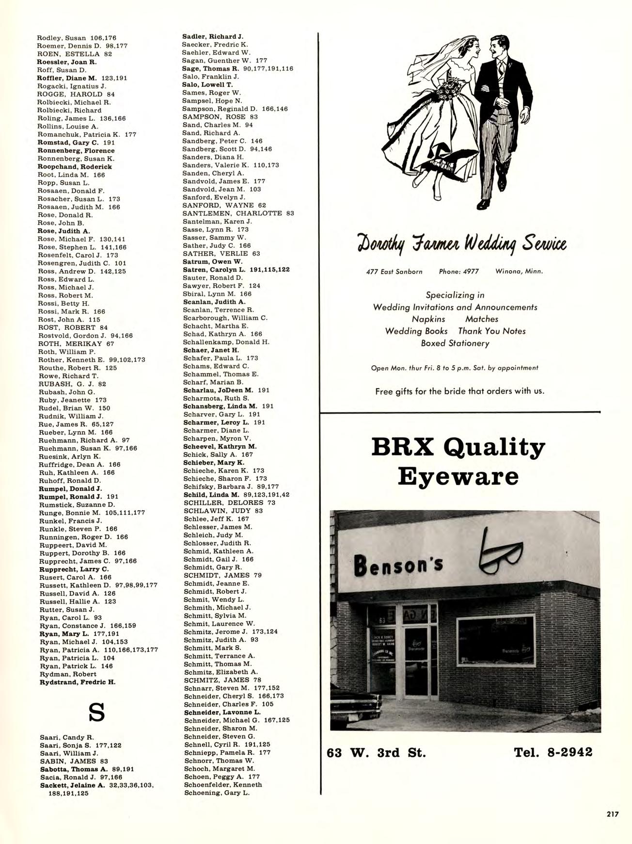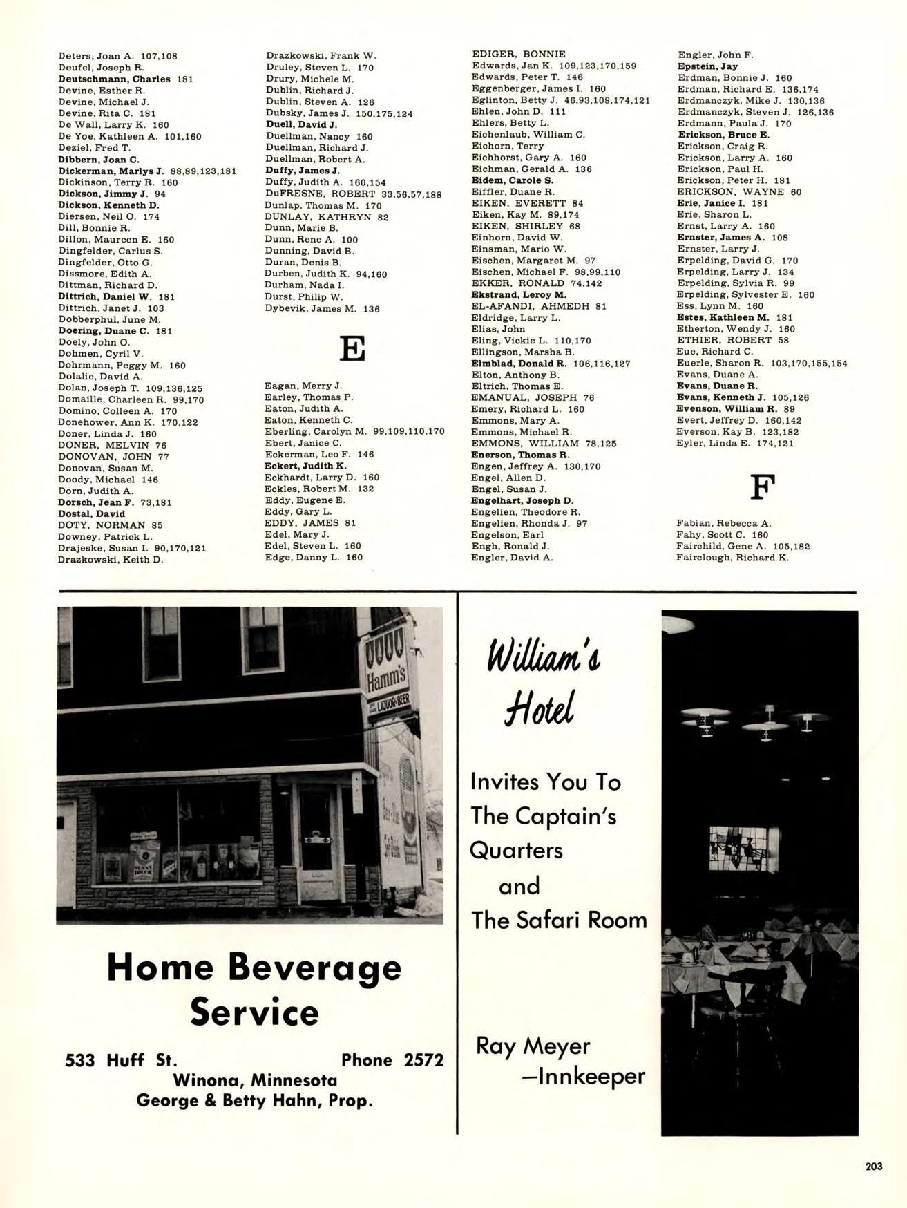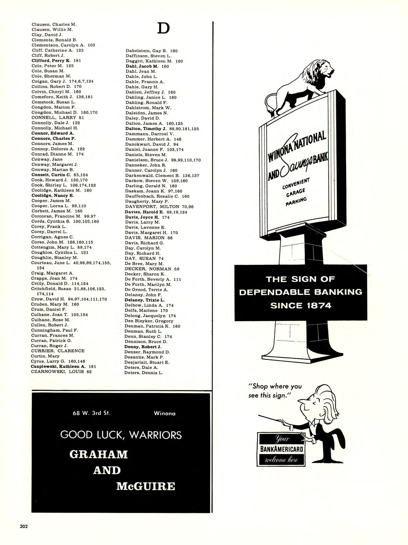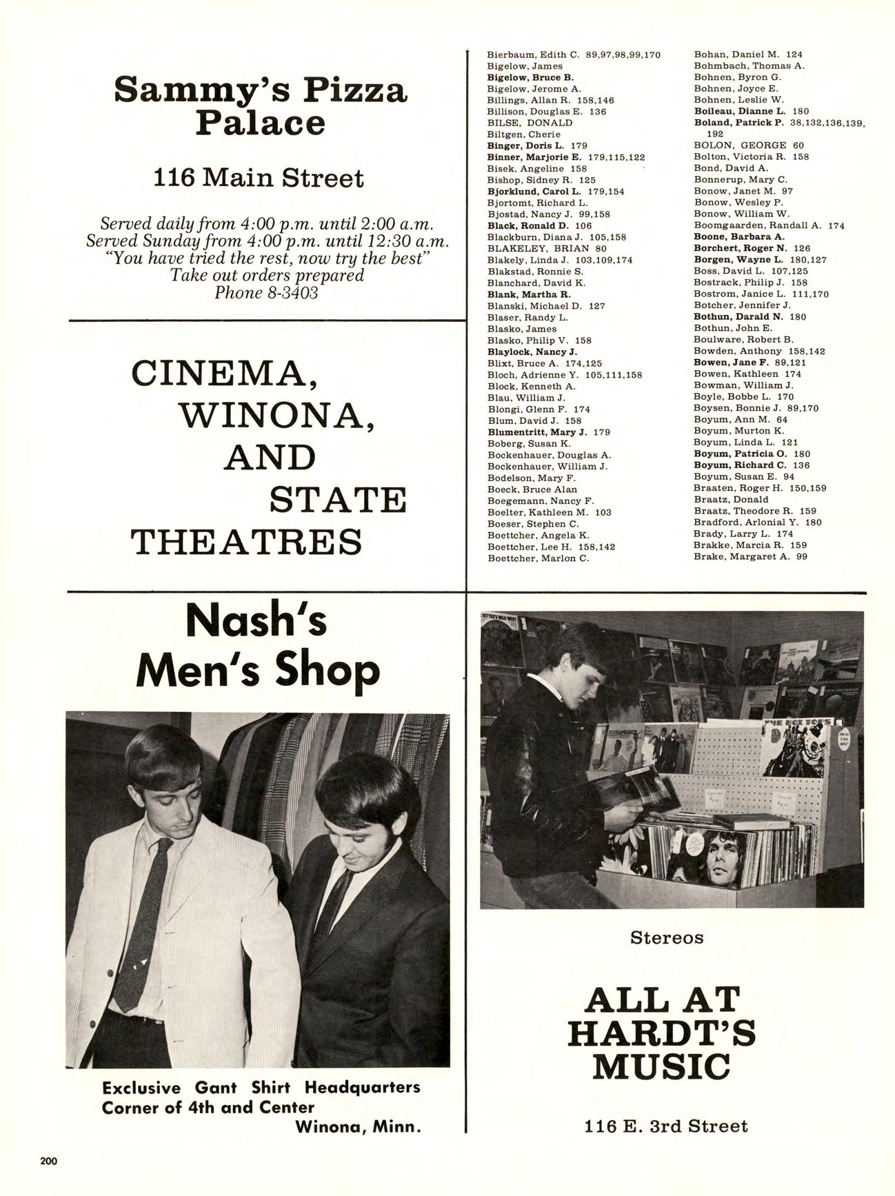 Is best viewed from the top of Garvin Heights. From that impressive height Can be seen all of Winona, which is, For most of us, not just another Town but the Place where we work, worship. Spend money. Get educated, have fun, and Become involved. Whether it be as a Y-team advisor, A disc-jockey At a local radio station. Or a clerk in a store. And because we live here, taking Karate at the YMCA, Curling up in a big leather chair At the public library And never getting a ro u nd to study, Having a good time At Shakey’s and the Pizza Hut, And going into debt With that charge account at Stevensons, are all Things that become a part of our College experience.