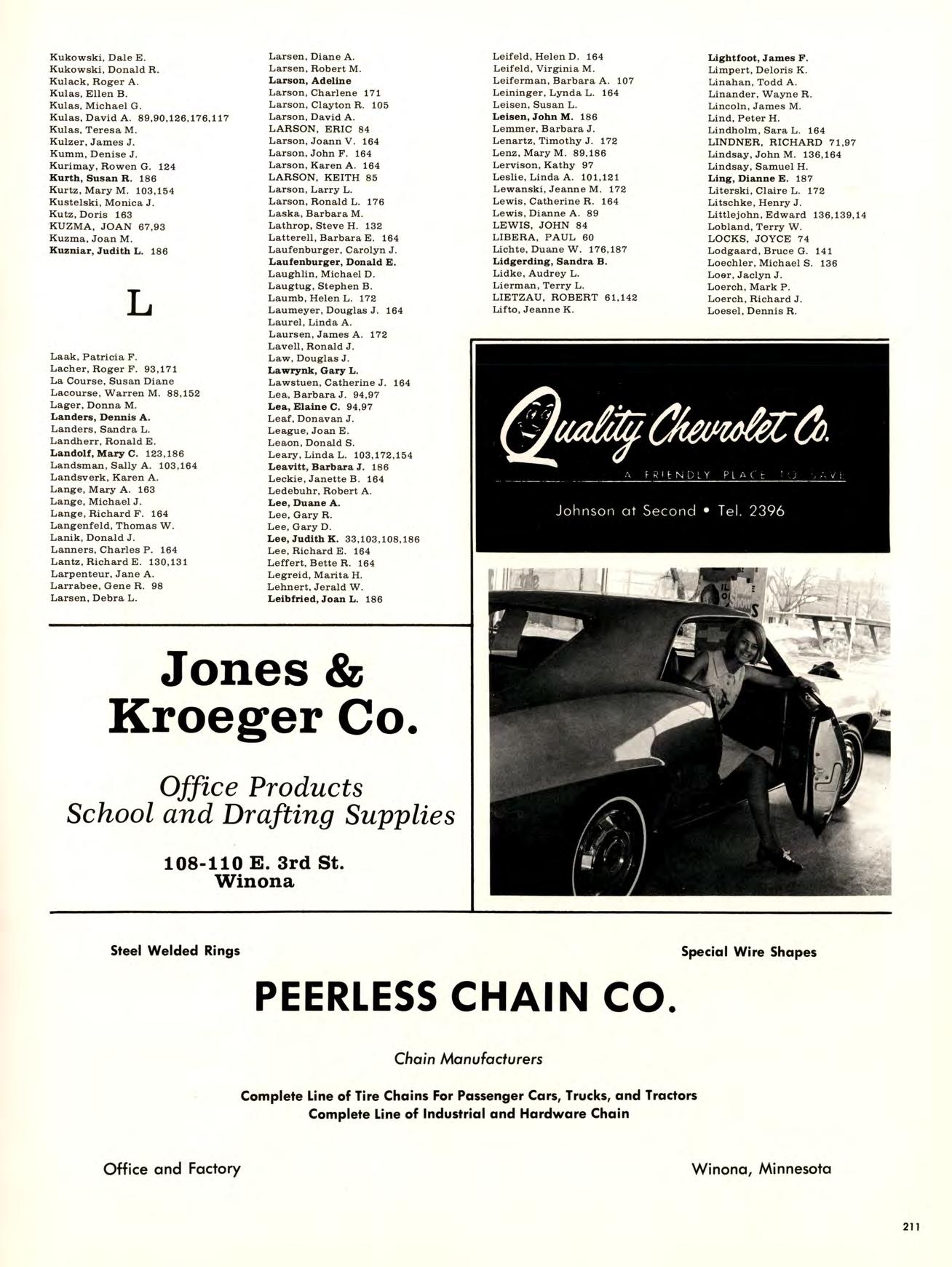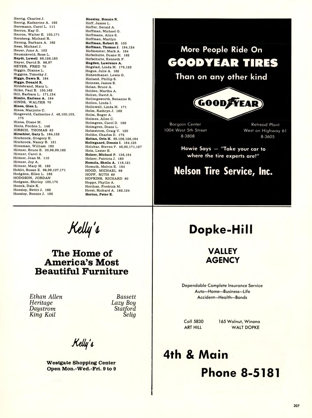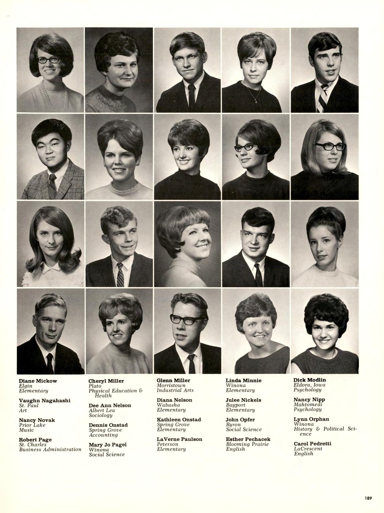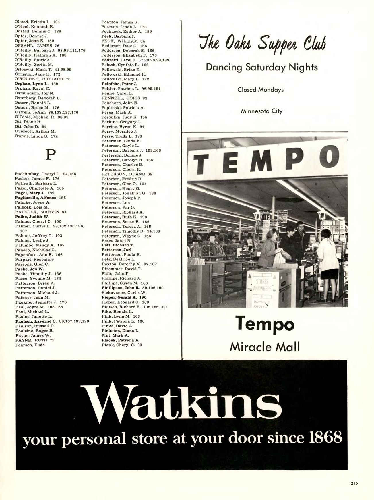 Is best viewed from the top of Garvin Heights. From that impressive height Can be seen all of Winona, which is, For most of us, not just another Town but the Place where we work, worship. Spend money. Get educated, have fun, and Become involved. Whether it be as a Y-team advisor, A disc-jockey At a local radio station. Or a clerk in a store. And because we live here, taking Karate at the YMCA, Curling up in a big leather chair At the public library And never getting a ro u nd to study, Having a good time At Shakey’s and the Pizza Hut, And going into debt With that charge account at Stevensons, are all Things that become a part of our College experience.