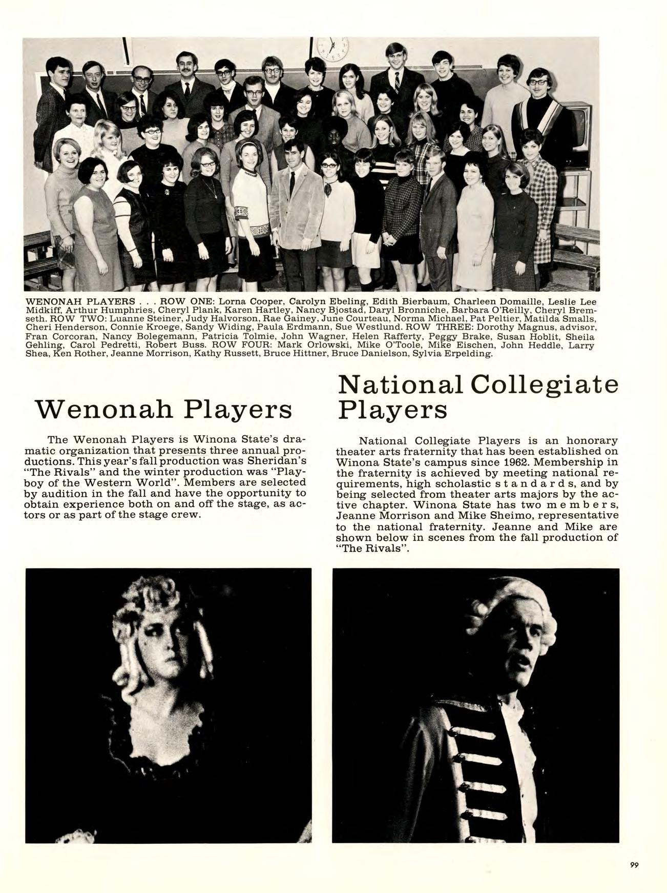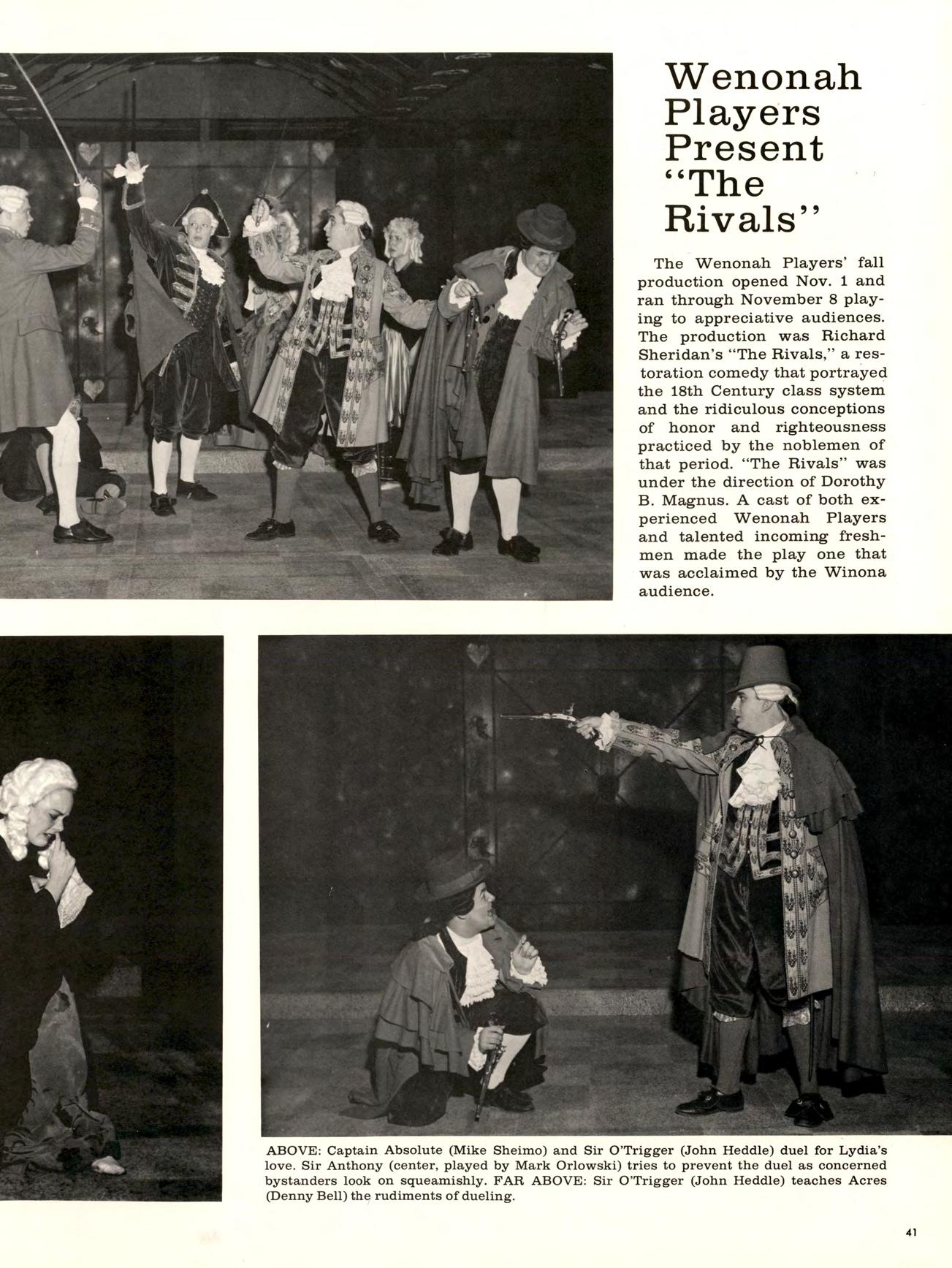 The Wenonah Players’ fall production opened Nov. 1 and ran through November 8 playing to appreciative audiences. The production was Richard Sheridan’s “The Rivals,” a restoration comedy that portrayed the 18th Century class system and the ridiculous conceptions of honor and righteousness practiced by the noblemen of that period. “The Rivals” was under the direction of Dorothy B. Magnus. A cast of both experienced Wenonah Players and talented incoming freshmen made the play one that was acclaimed by the Winona audience.