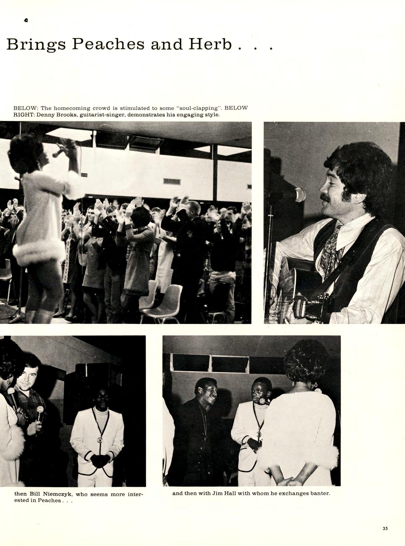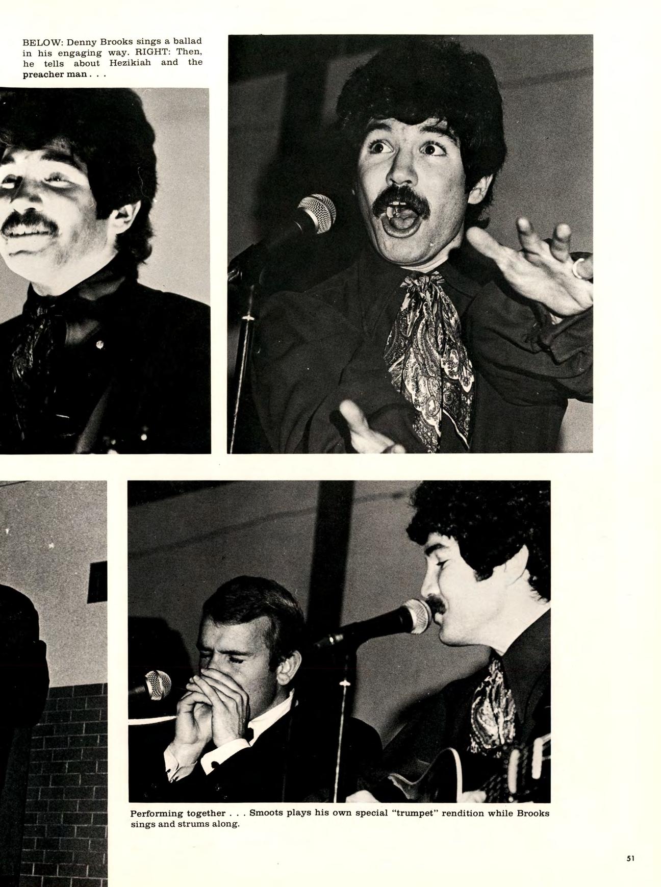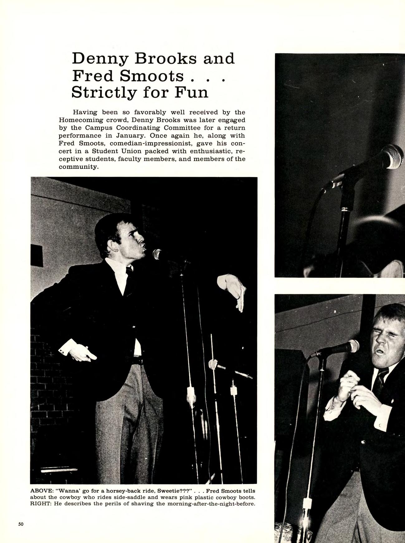 Having been so favorably well received by the Homecoming crowd, Denny Brooks was later engaged by the Campus Coordinating Committee for a return performance in January. Once again he, along with Fred Smoots, comedian-impressionist, gave his concert in a Student Union packed with enthusiastic, receptive students, faculty members, and members of the community.