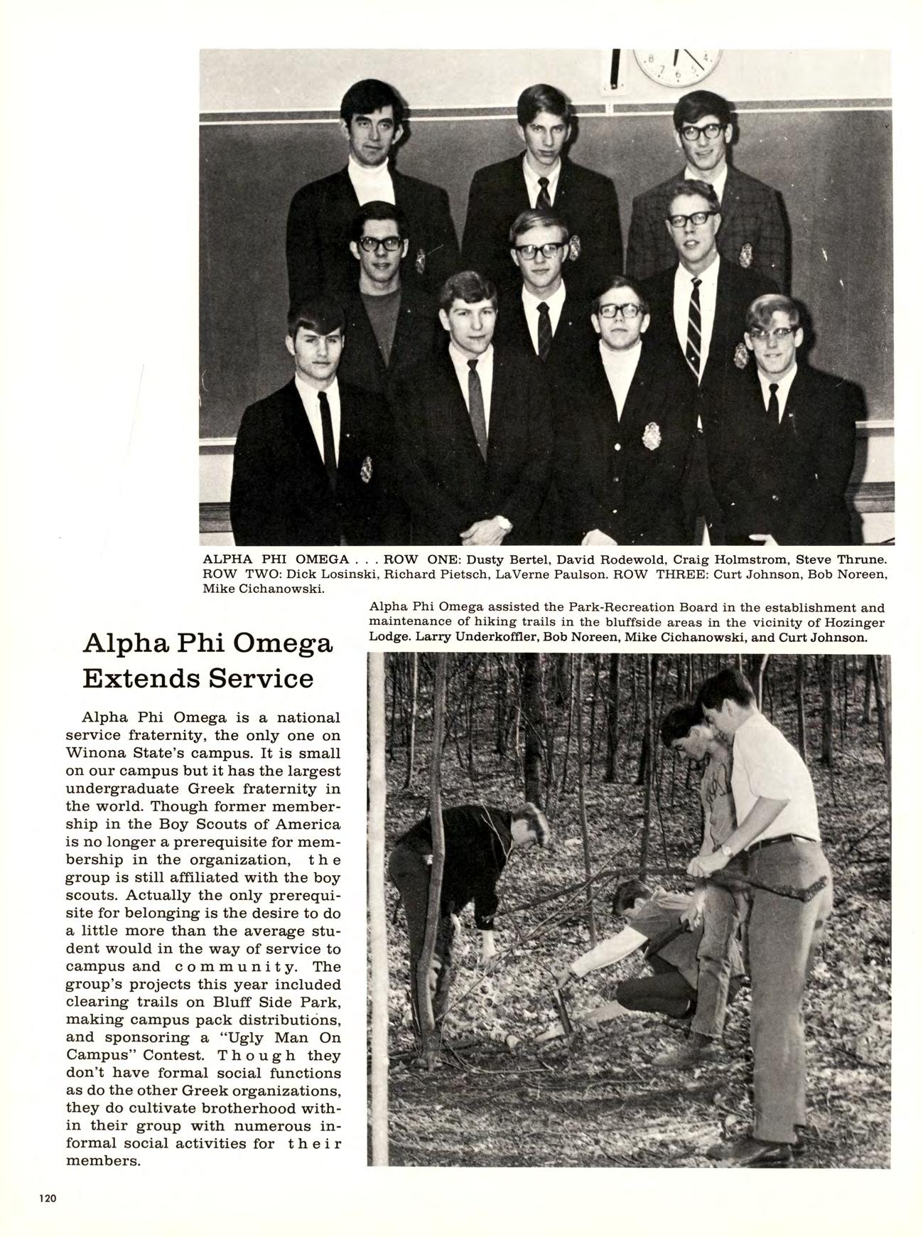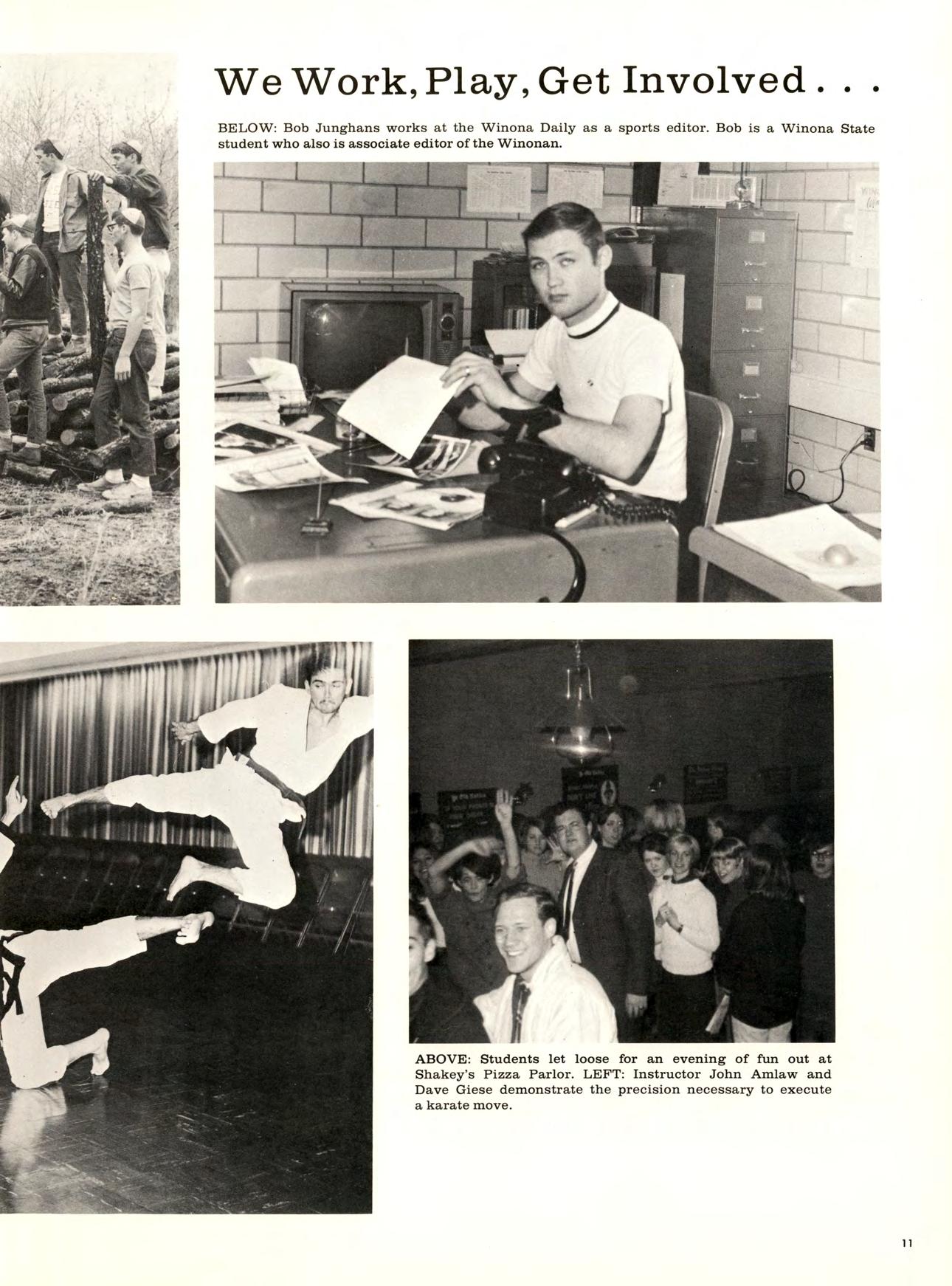 ABOVE: The community YMCA is the place to go for instruction in self-defense. Winona State student John Amlaw is the instructor for several classes in karate there. The session begins with “rai”, a ceremonial bowing to the instructor. FAR ABOVE: Phi Sig pledges involve themselves in community service by chopping and gathering firewood for the lodges on Prarie Island.