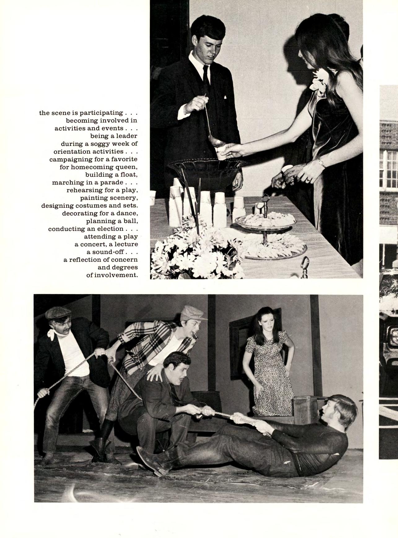 the scene is participating becoming involved in activities and events being a leader during a soggy week of orientation activities campaigning for a favorite for homecoming queen, building a float, marching in a parade rehearsing for a play, painting scenery, designing costumes and sets, decorating for a dance, planning a ball, conducting an election attending a play a concert, a lecture a sound-off a reflection of concern and degrees of involvement.