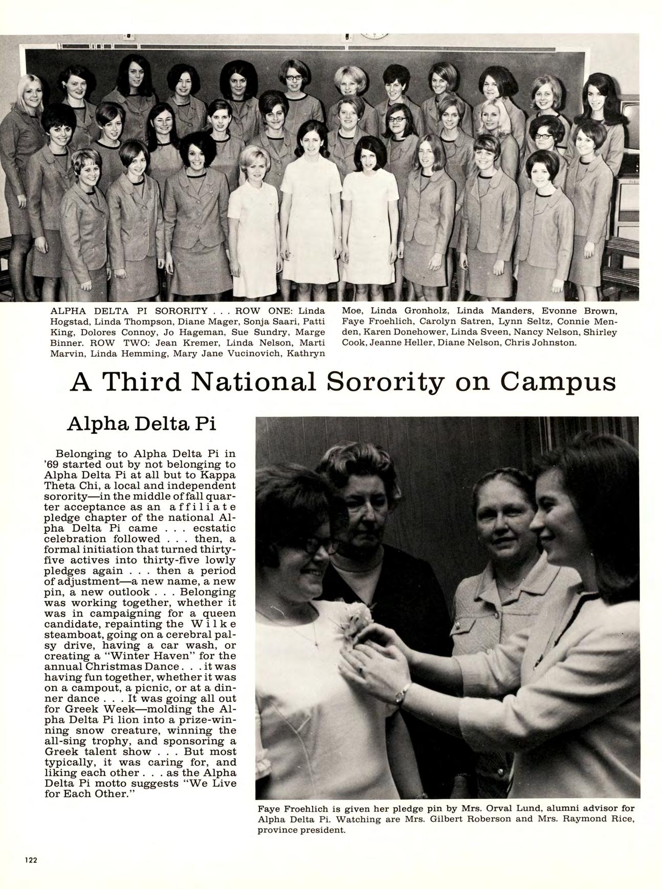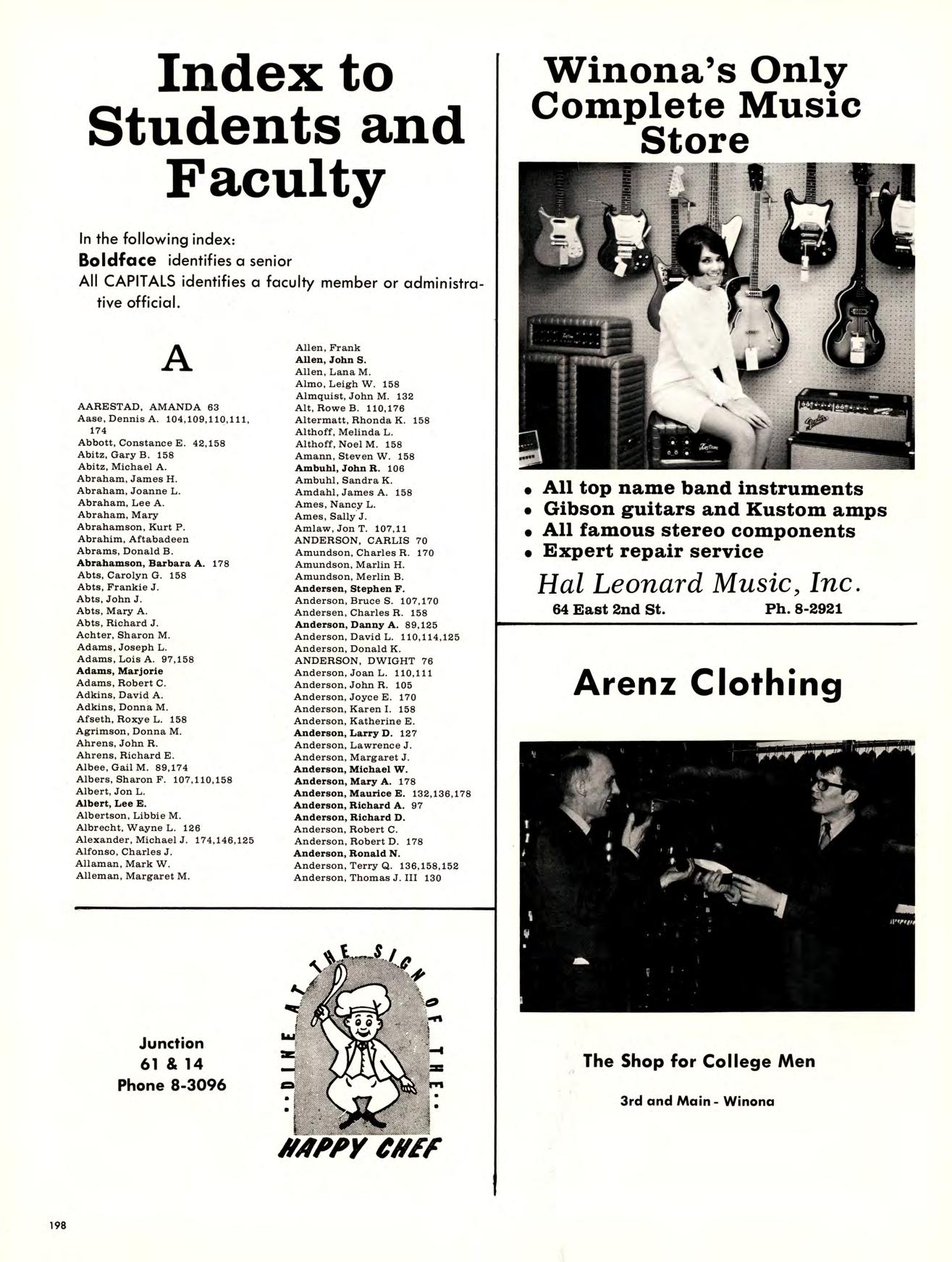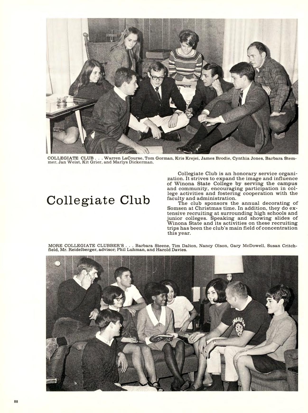 Winona State students, faculty, and their guests, had a chance to come in out of the cold into a warm, cheerful “Winter Haven” on December 6th. The annual Christmas Dance, traditionally sponsored by Alpha Delta Pi sorority, was quite in keeping with the old-fashioned Christmas spirit. A holiday mood was created with glittering ceiling ornaments, flocked greens, a small country church, snowmen, mistletoe and floodlights. Holiday spirits were enhanced by appropriate music provided by the Tom Lee Orchestra, and the evening was highlighted by a visit from Santa Claus.