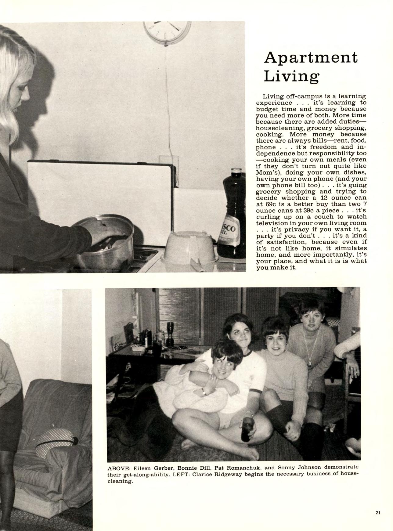 Living off-campus is a learning experience it’s learning to budget time and money because you need more of both. More time because there are added duties— housecleaning, grocery shopping, cooking. More money because there are always bills—rent, food, phone it’s freedom and independence but responsibility too —cooking your own meals (even if they don’t turn out quite like Mom’s), doing your own dishes, having your own phone (and your own phone bill too) it’s going grocery shopping and trying to decide whether a 12 ounce can at 69c is a better buy than two 7 ounce cans at 39c a piece it’s curling up on a couch to watch television in your own living room it’s privacy if you want it, a party if you don’t it’s a kind of satisfaction, because even if it’s not like home, it simulates home, and more importantly, it’s your place, and what it is is what you make it.