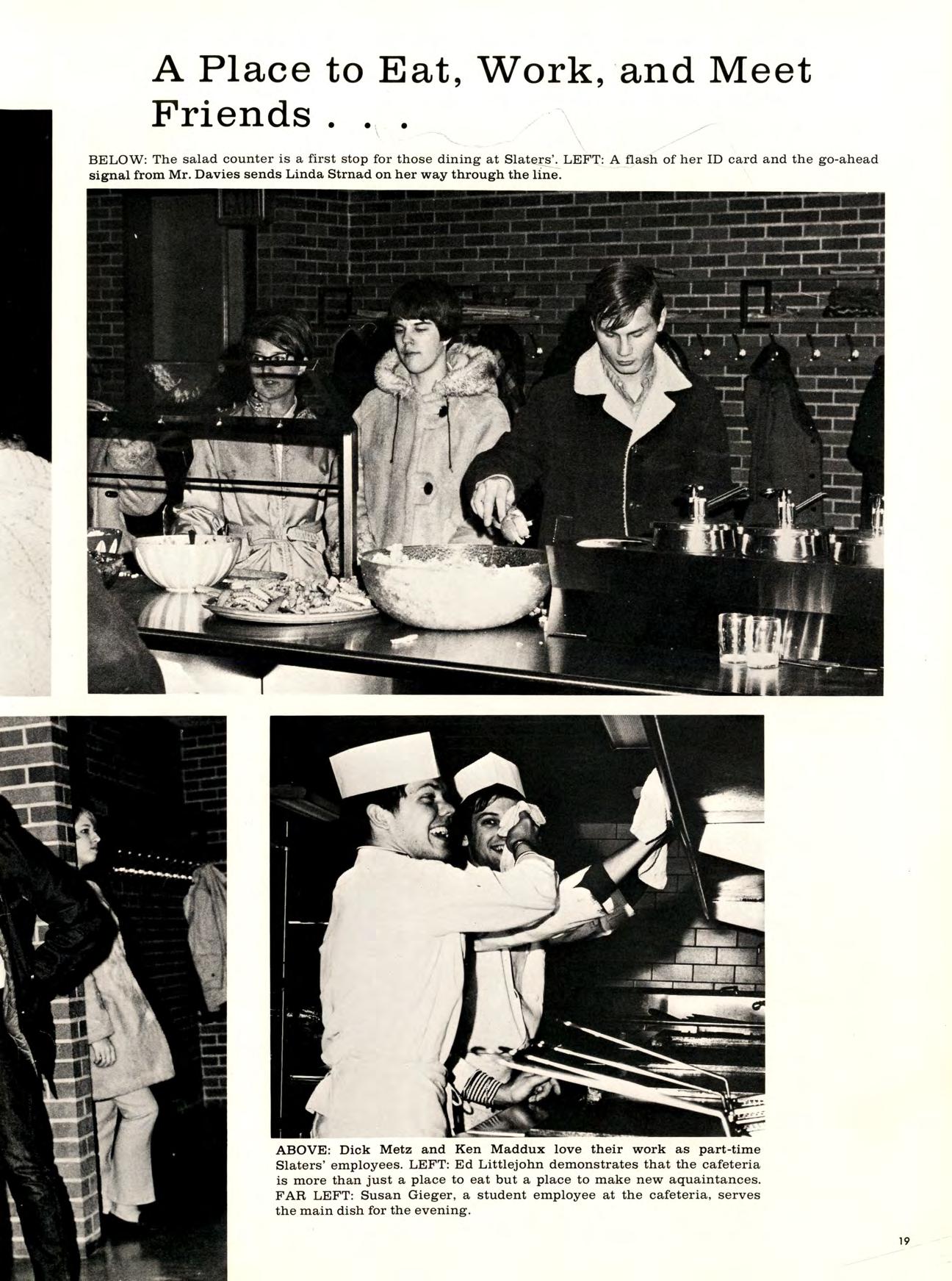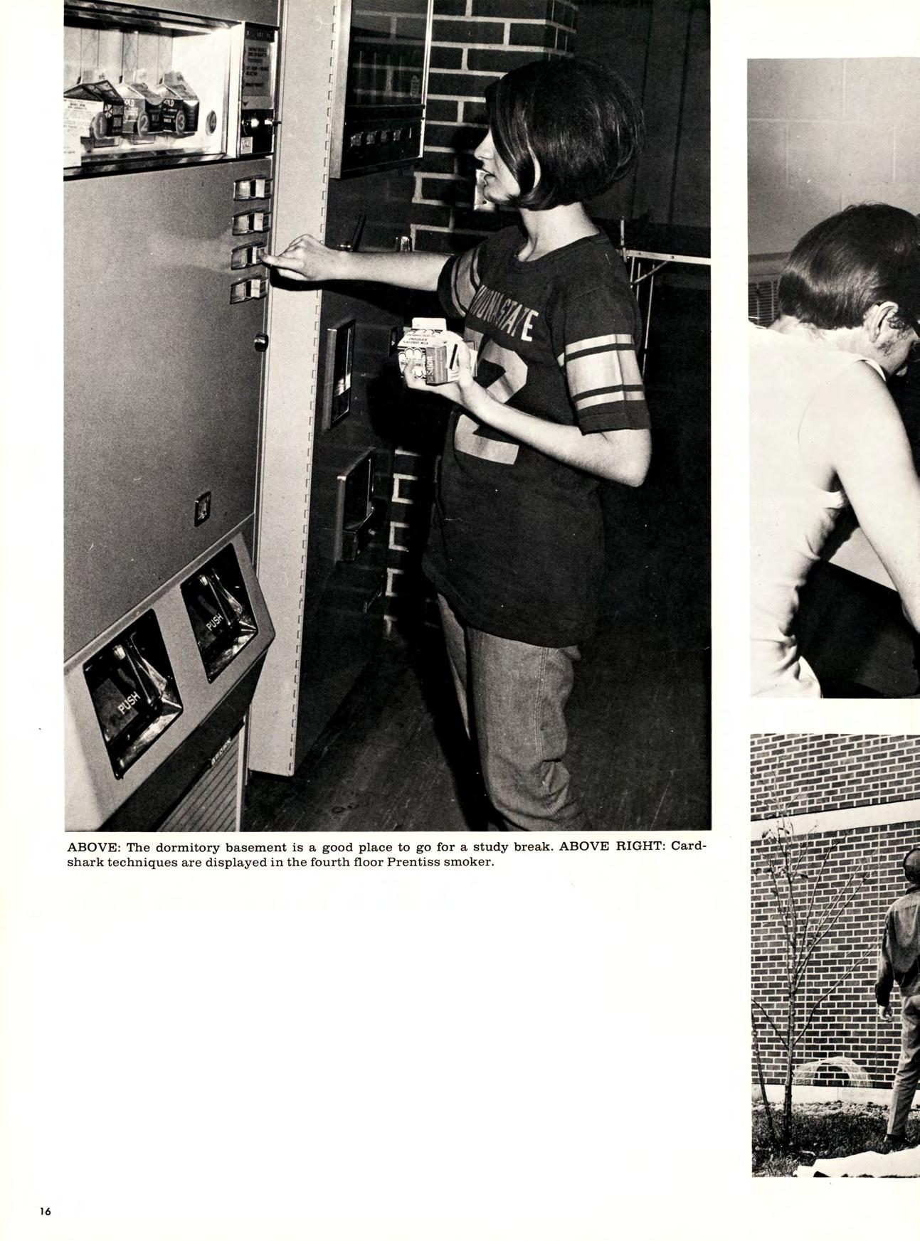 Living on campus is an elbowrubbing sort of thing—you get to know people because existing is a community project it’s like having twenty-five roommates and a special kind of builtin telephone answering service it’s having an RA, screaming for quiet, or, lending a friendly ear to problems or gripes it’s having an audience while you say goodnight to your date in a fishbowl-type atmosphere it’s dining regularily (or not so regularity) at Slater’s and supplementing that with quick trips to the candy and pop machines in the basement if you live in Sheehan it’s cringing in your nightgown and hair rollers in the back part of the elevator as it slowly opens on first floor and complete strangers in the lobby stare back at you it’s fire-drills at four in the morning, all night gab sessions, floor meetings, and, if you’re a freshman, it’s keeping “hours” and the fear of being late. But, more importantly it’s living together forming attachments and a kind of bond so that you know your floor and dorm are best—whether it’s third floor Richards or eighth floor Sheehan.