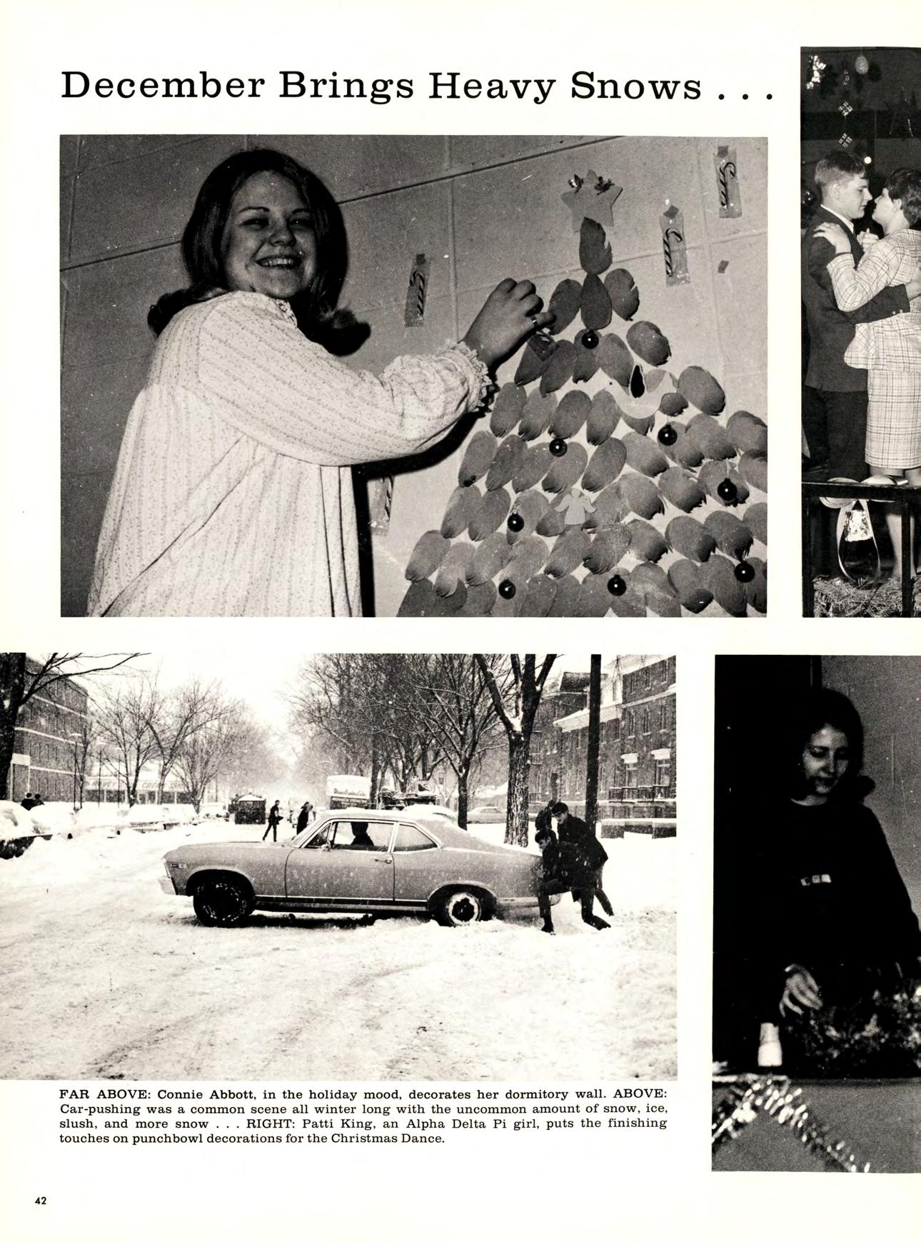 FAR ABOVE: Connie Abbott, in the holiday mood, decorates her dormitory wall. ABOVE: Car-pushing was a common scene all winter long with the uncommon amount of snow, ice, slush, and more snow RIGHT: Patti King, an Alpha DeltaPi girl, puts the finishing touches on punchbowl decorations for the Christmas Dance.
