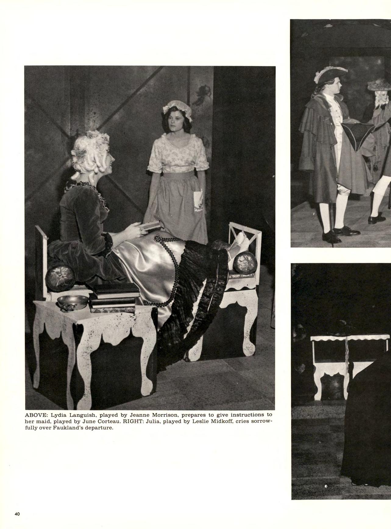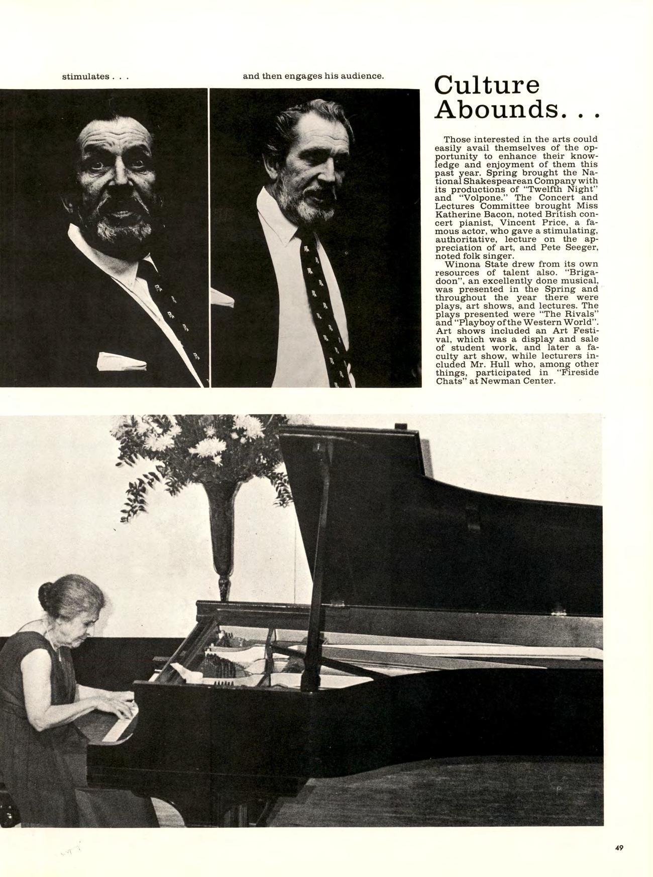 Those interested in the arts could easily avail themselves of the opportunity to enhance their knowledge and enjoyment of them this past year. Spring brought the National Shakespearean Company with its productions of “Twelfth Night” and “Volpone.” The Concert and Lectures Committee brought Miss Katherine Bacon, noted British concert pianist, Vincent Price, a famous actor, who gave a stimulating, authoritative, lecture on the appredation of art, and Pete Seeger, noted folk singer.