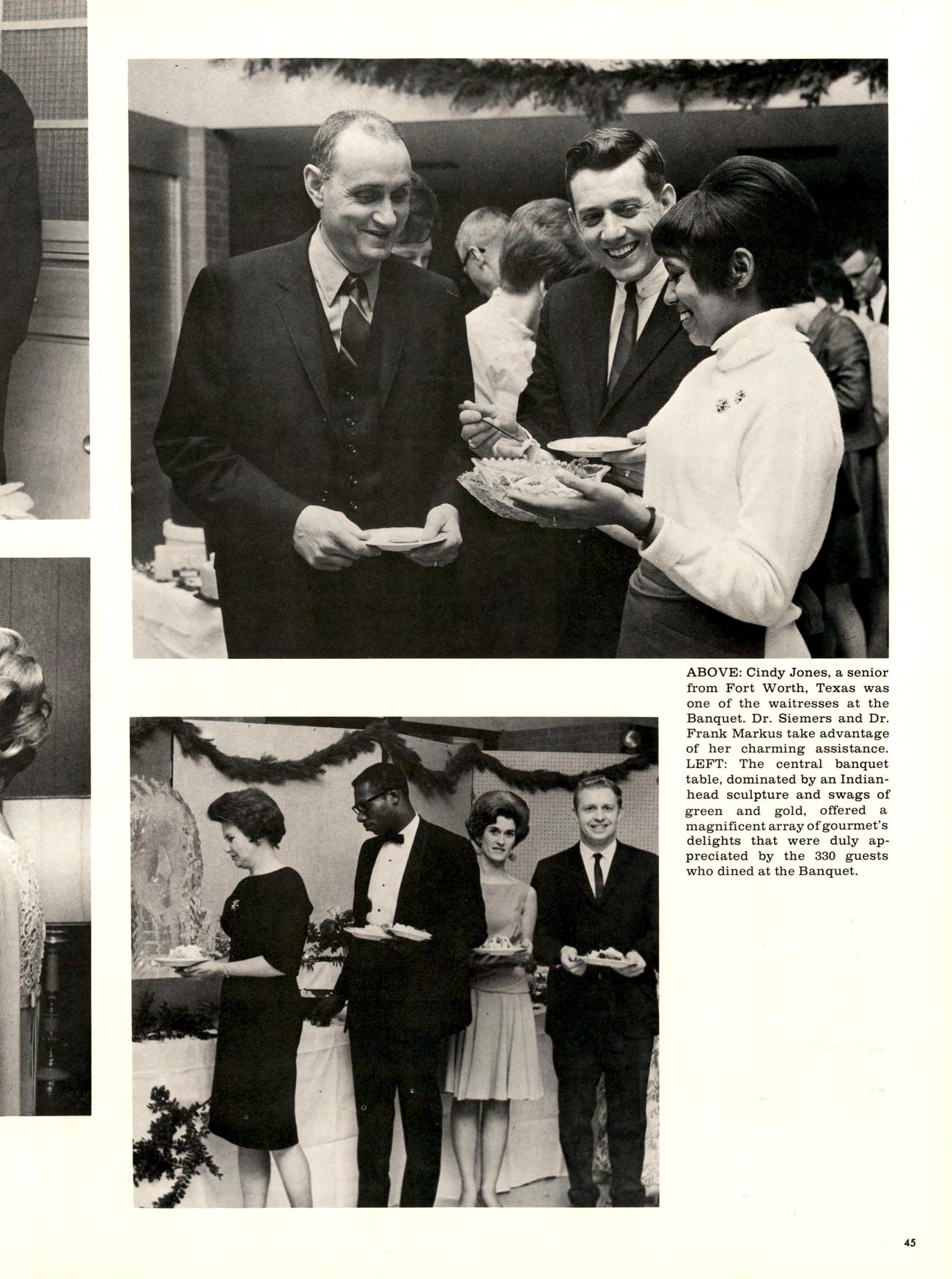 ABOVE: Cindy Jones, a senior from Fort Worth, Texas was one of the waitresses at the Banquet. Dr. Siemers and Dr. Frank Markus take advantage of her charming assistance.