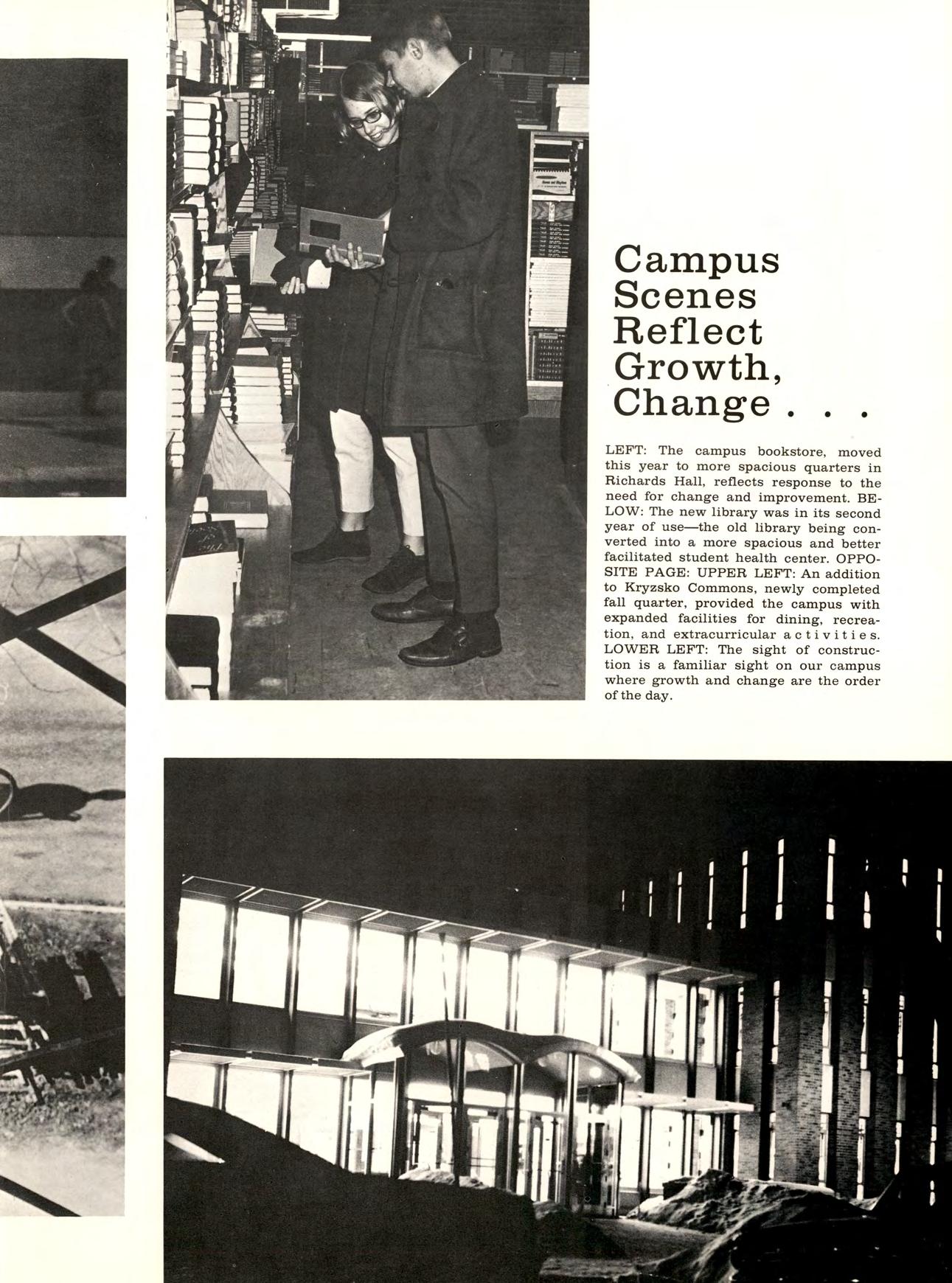 LEFT: The campus bookstore, moved this year to more spacious quarters in Richards Hall, reflects response to the need for change and improvement. BELOW: The new library was in its second year of use—the old library being converted into a more spacious and better facilitated student health center. OPPOSITE PAGE: UPPER LEFT: An addition to Kryzsko Commons, newly completed fall quarter, provided the campus with expanded facilities for dining, recreation, and extracurricular activities.