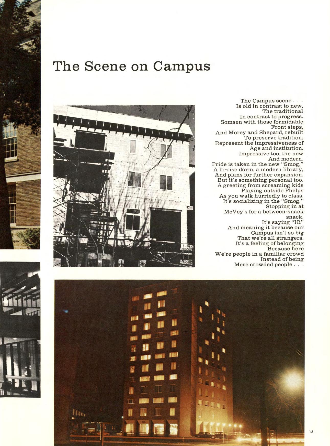Is old in contrast to new, The traditional In contrast to progress. Somsen with those formidable Front steps, And Morey and Shepard, rebuilt To preserve tradition. Represent the impressiveness of Age and institution. Impressive too, the new And modern. Pride is taken in the new “Smog,” A hi-rise dorm, a modern library. And plans for further expansion. But it’s somethingpersonal too. A greeting from screaming kids Playing outside Phelps As you walk hurriedly to class. It’s socializing in the “Smog.” Stopping in at McVey’s for a between-snack snack. It’s saying “Hi” And meaning it because our Campus isn’t so big That we’re all strangers. It’s a feeling of belonging Because here We’re people in a familiar crowd Instead of being Mere crowded people