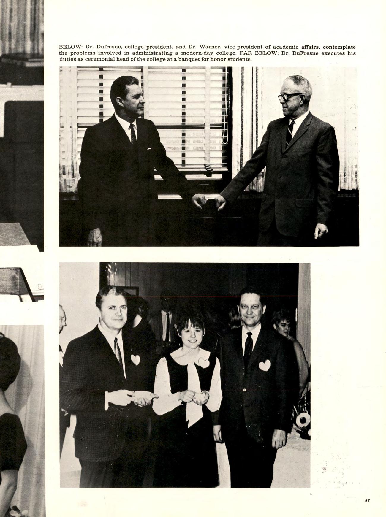 BELOW: Dr. Dufresne, college president, and Dr. Warner, vice-president of academie affairs, contemplate the problems involved in administrating a modern-day college. FAR BELOW: Dr. DuFresne executes his duties as ceremonial head of the college at a banquet for honor students.