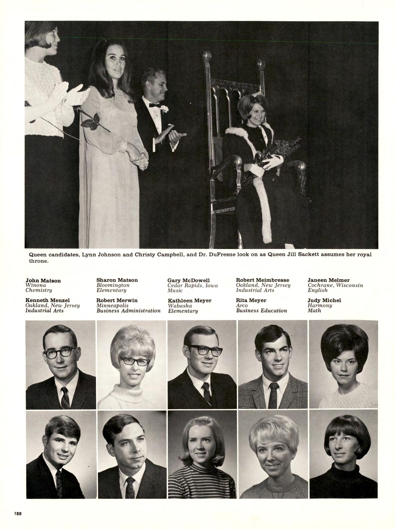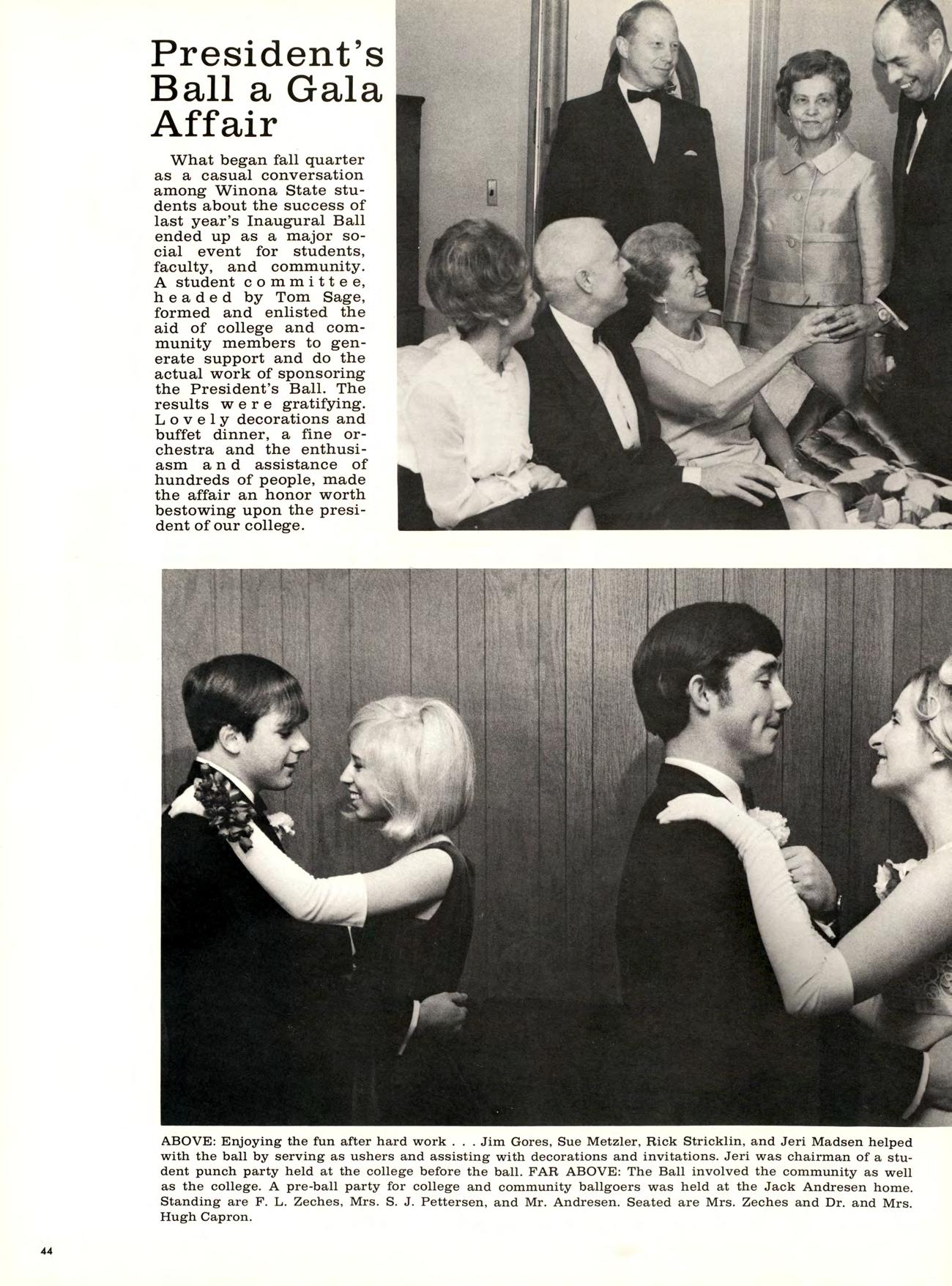 What began fall quarter as a casual conversation among Winona State students about the success of last year’s Inaugural Ball ended up as a major social event for students, faculty, and community. A student committee, headed by Tom Sage, formed and enlisted the aid of college and community members to generate support and do the actual work of sponsoring the President’s Ball, The results were gratifying. Lovely decorations and buffet dinner, a fine orchestra and the enthusiasm and assistance of hundreds of people, made the affair an honor worth bestowing upon the president of our college.