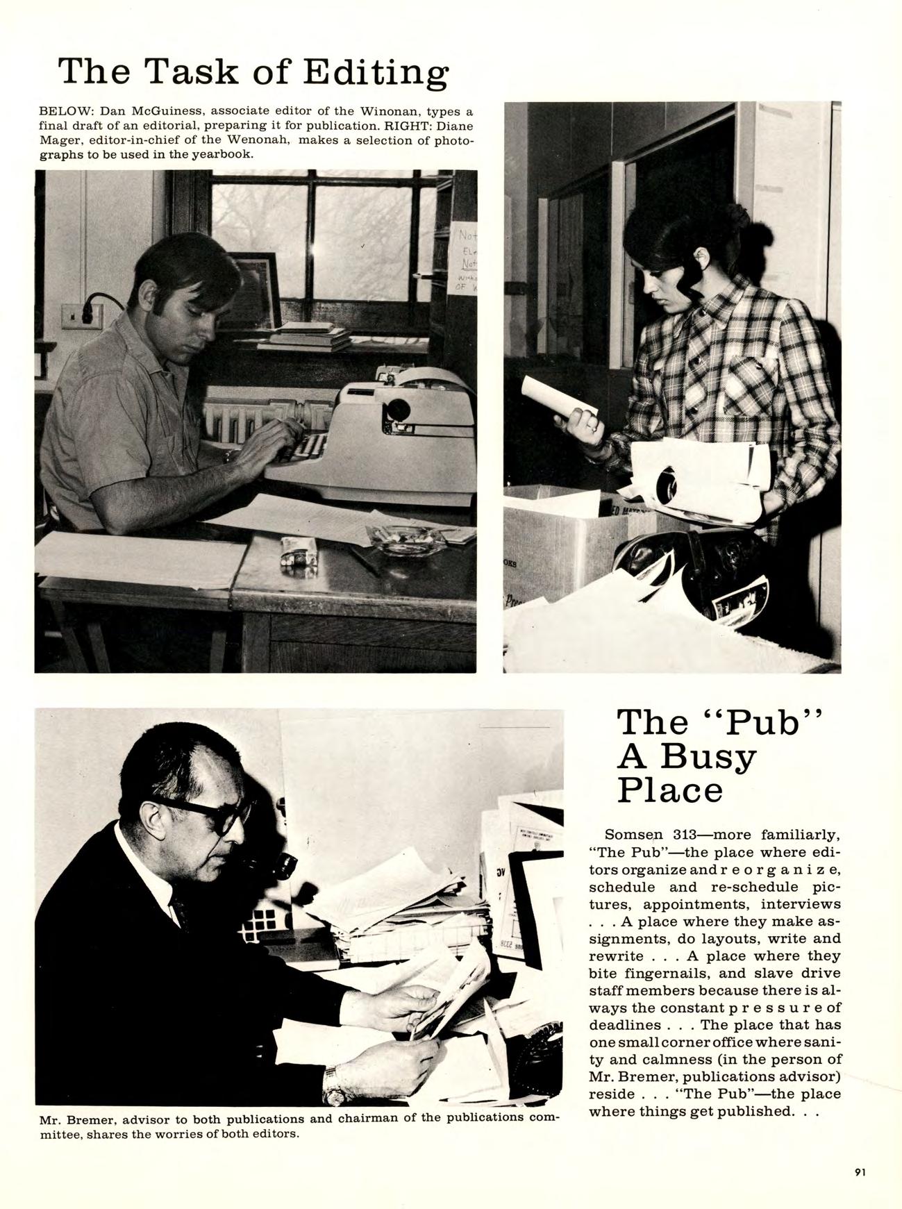 Diane Mager, Editor-in-chief; Roger Fischbach and Gary Anhalt. Assistant Sport Editors; Maureen R o d i c h Advertisements; Paul McNallan, Business Manager; Stajf: Linda Nelson, Linda Schild, and Gene Larrabee; Wally Schultz and Chris Grajczyk, Photography; Mr. Bremer, Advisor.