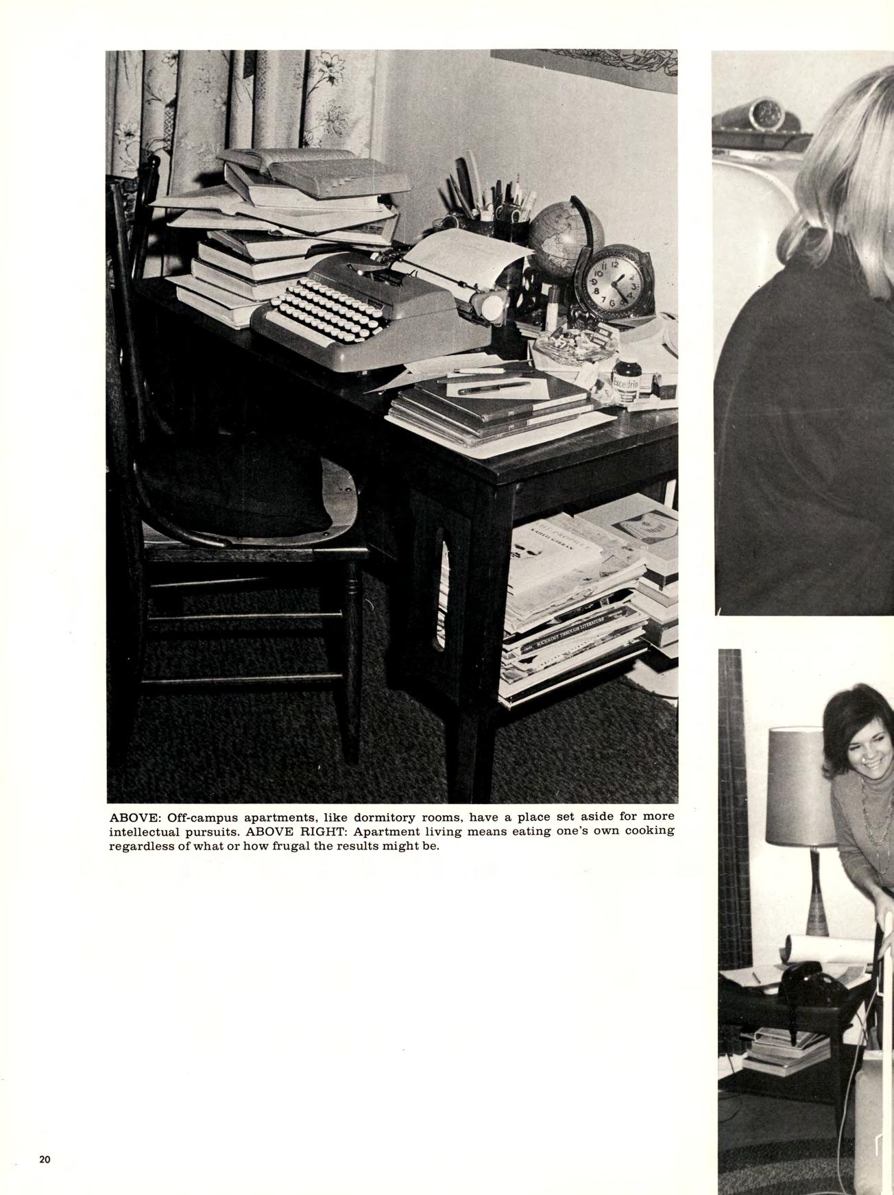 ABOVE: Off-campus apartments, like dormitory rooms, have a place set aside for more intellectual pursuits. ABOVE RIGHT: Apartment living means eating one’s own cooking regardless of what or how frugal the results might be.
