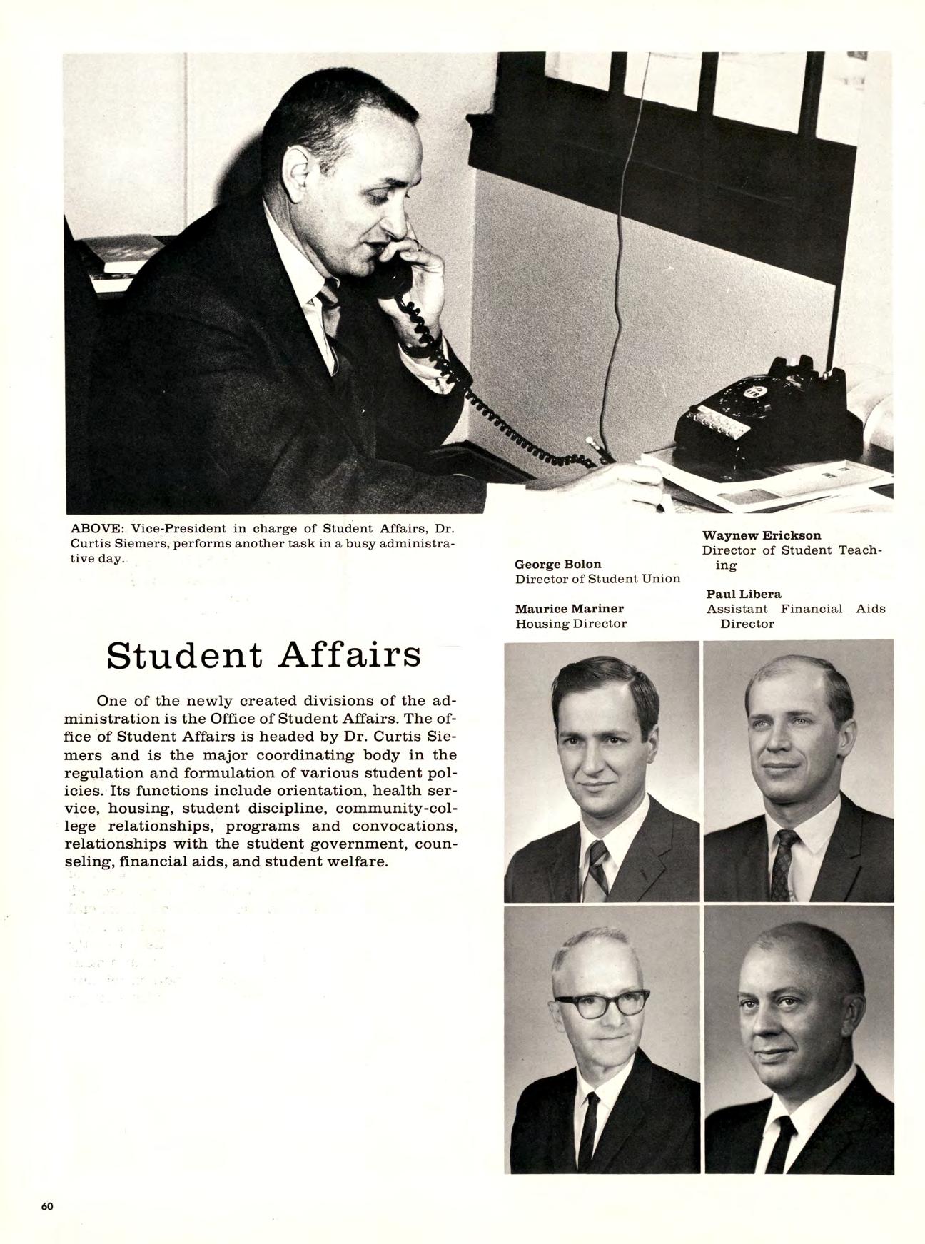 One of the newly created divisionsof the administration is the Office of Student Affairs. The office of Student Affairs is headed by Dr. Curtis Siemers and is the major coordinating body in the regulation and formulation of various student policies. Its functions include orientation, health service, housing, student discipline, community-college relationships, programs and convocations, relationships with the student government, counseling, financial aids, and student welfare.