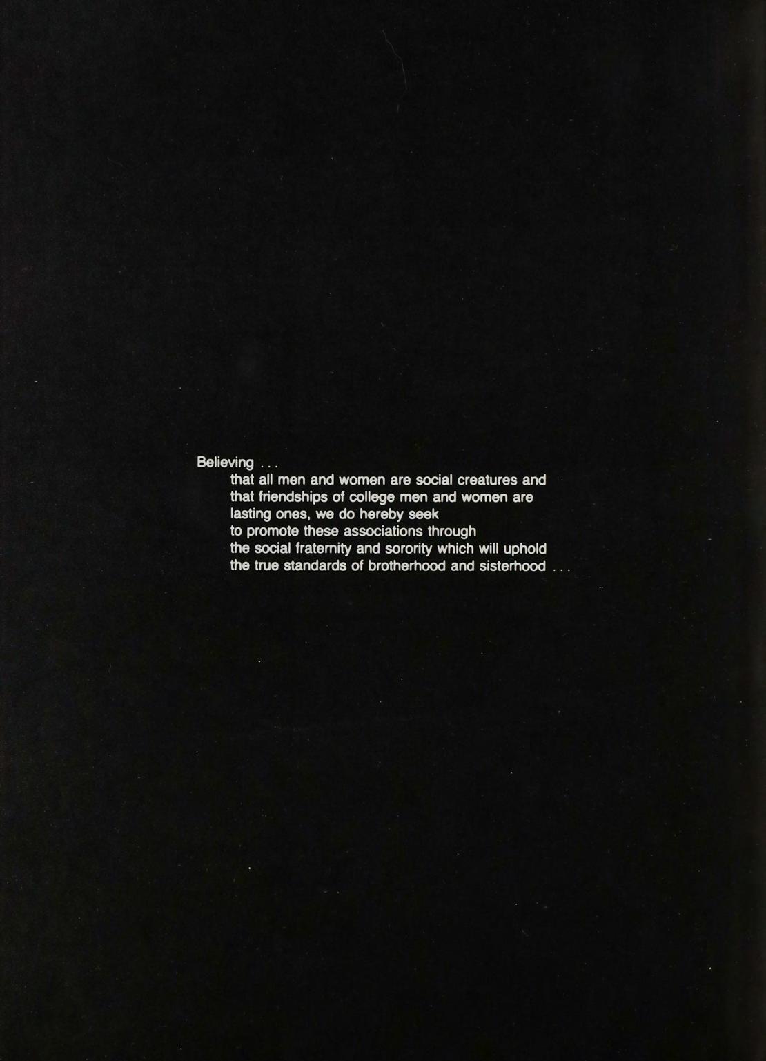 Believing that all men and women are social creatures and that friendships of college men and women are lasting ones, we do hereby seek to promote these associations through the social fraternity and sorority which will uphold the true standards of brotherhood and sisterhood