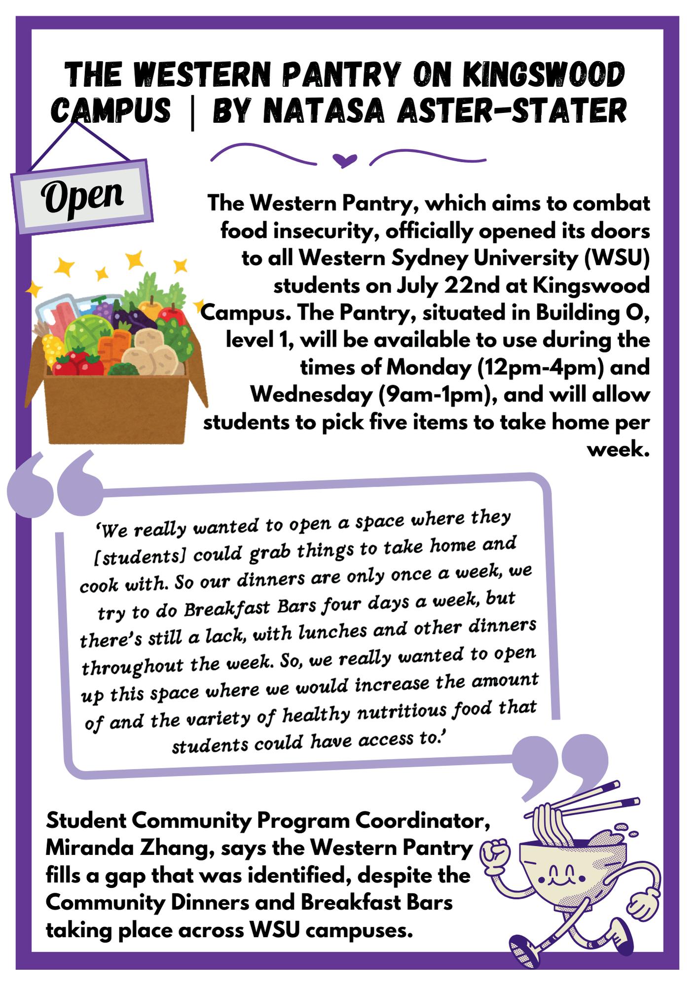 The Western Pantry, which aims to combat food insecurity, officially opened its doors to all Western Sydney University (WSU) students on July 22nd at Kingswood Campus. The Pantry, situated in Building 0, level 1, will be available to use during the times of Monday (12pm-4pm) and Wednesday (9am-1pm), and will allow students to pick five items to take home per week.