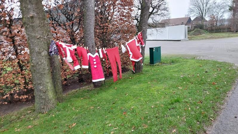 We passeren een boerderij waar de was van kerstman en kerstvrouw buiten hangt. Daar maken we natuurlijk een foto van.