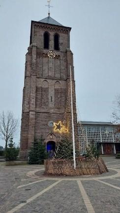 Voor de imposante kerktoren staat een kerstboom, bestaand uit lichtjes aan een mast. Even naar links ligt Café De Drie Linden, de startplaats voor vandaag. Na aanmelden en koffie gaan we van start. Het weer is grijs en er staat een straffe, koude wind. We lopen al snel het dorp uit en gaan via zandwegen naar het buurtschap Boscheind, waar de kerststal het eerste is dat we zien. Daar is veel werk aan besteed, er loopt zelfs levende have rond zoals schapen en kippen. We zien het kind al in de kribbe liggen, eigenlijk hoort dat niet, maar ach, daar zitten we niet mee.