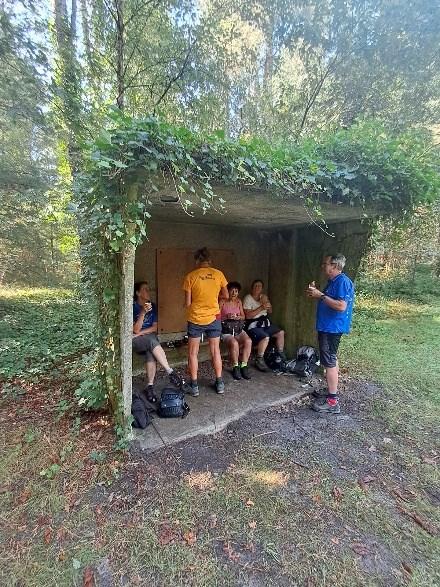 Bij een soort van “bushokje” hebben we een korte pauze. (Wandelknp 35)
