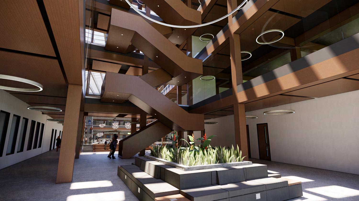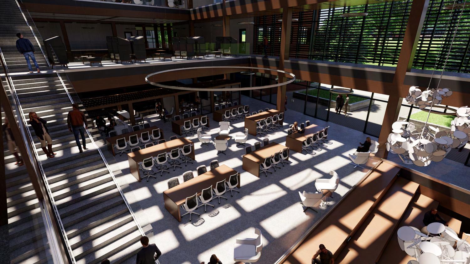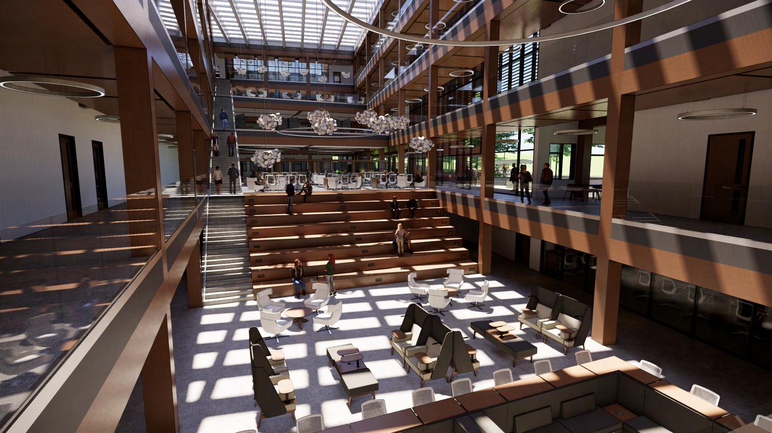 LOOKING TOWARDS COLLABORATION SPACES & STADIUM STEPS AT MAIN ATRIUM