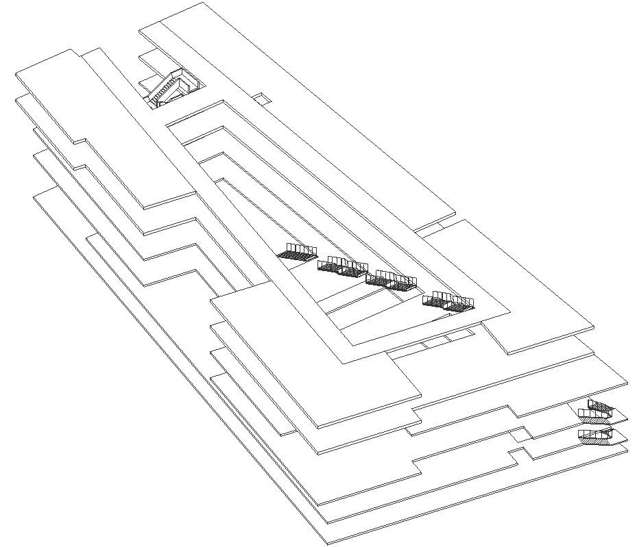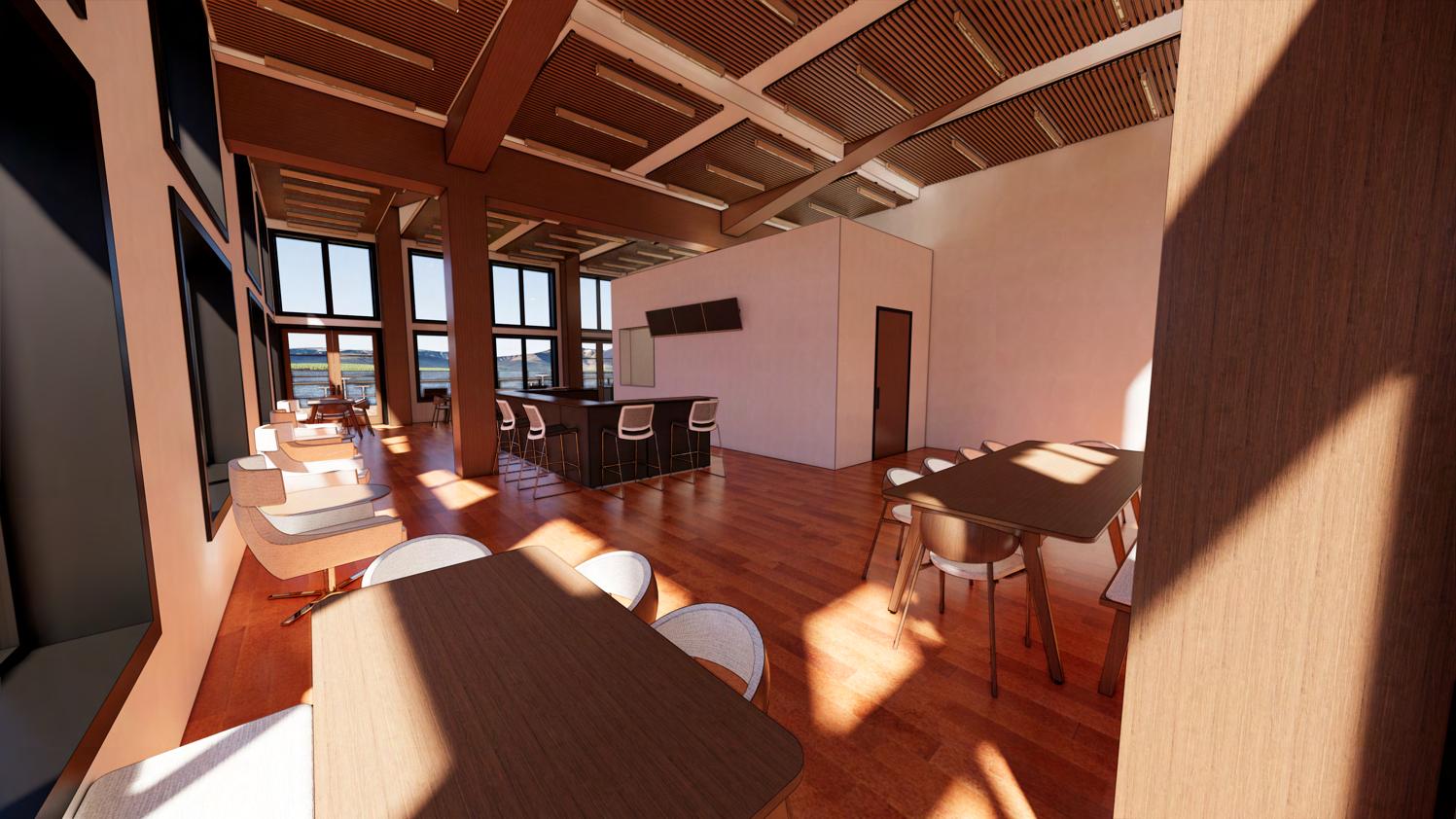Meant to serve as a replacement to existing architecture complex of Lawrence Hall at the University of Oregon, the Swansong School of Architecture was designed to be the total opposite of what Lawrence Hall is: open and bright. The primary driving force behind the design of the building was the central atrium space that all of the buildings primary programs and hallways wrap around. The atrium space serves as the heart of the building. It is along the various hallways that wrap around it that connect the studios, offices, classrooms and library within the building that leads to it being the space where everyone flows out onto after a lecture or to meet up with friends, classmates and staff. While the atrium is mostly open air, two main bridges connect the east and west sides of it with two wide “collaboration” bridges. These two bridges serve as a space for students to meet up with classmates to work together on assignments as well as open air meeting spaces that can be used by professors outside of their offices to meet with students. Below the main floor is the basement level, which contains several critical areas. The two lecture halls along with the computer lab, and the woodshop and 3D Makerspace labs all wrap around 2 collaboration courtyards that offer a variety of seating and colloboration areas in an open air context. These spaces were made to feel open and inviting for students to match the open nature similar to that of the University of Oregon EMU (Student Union). The primary feature that ties all the levels all together are the grand staircase that goes up the east side of the atrium, as well as the wood-encased staircase in the entry lobby at the north end.