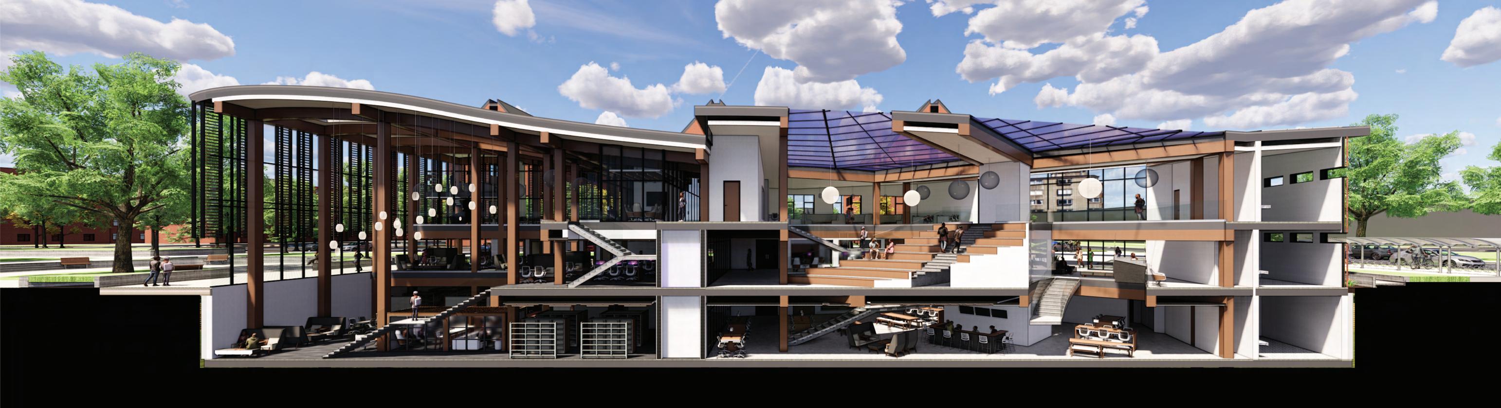 SECTION PERSPECTIVE SHOWING THE CENTRAL ATRIUM AND ACADEMIC WING