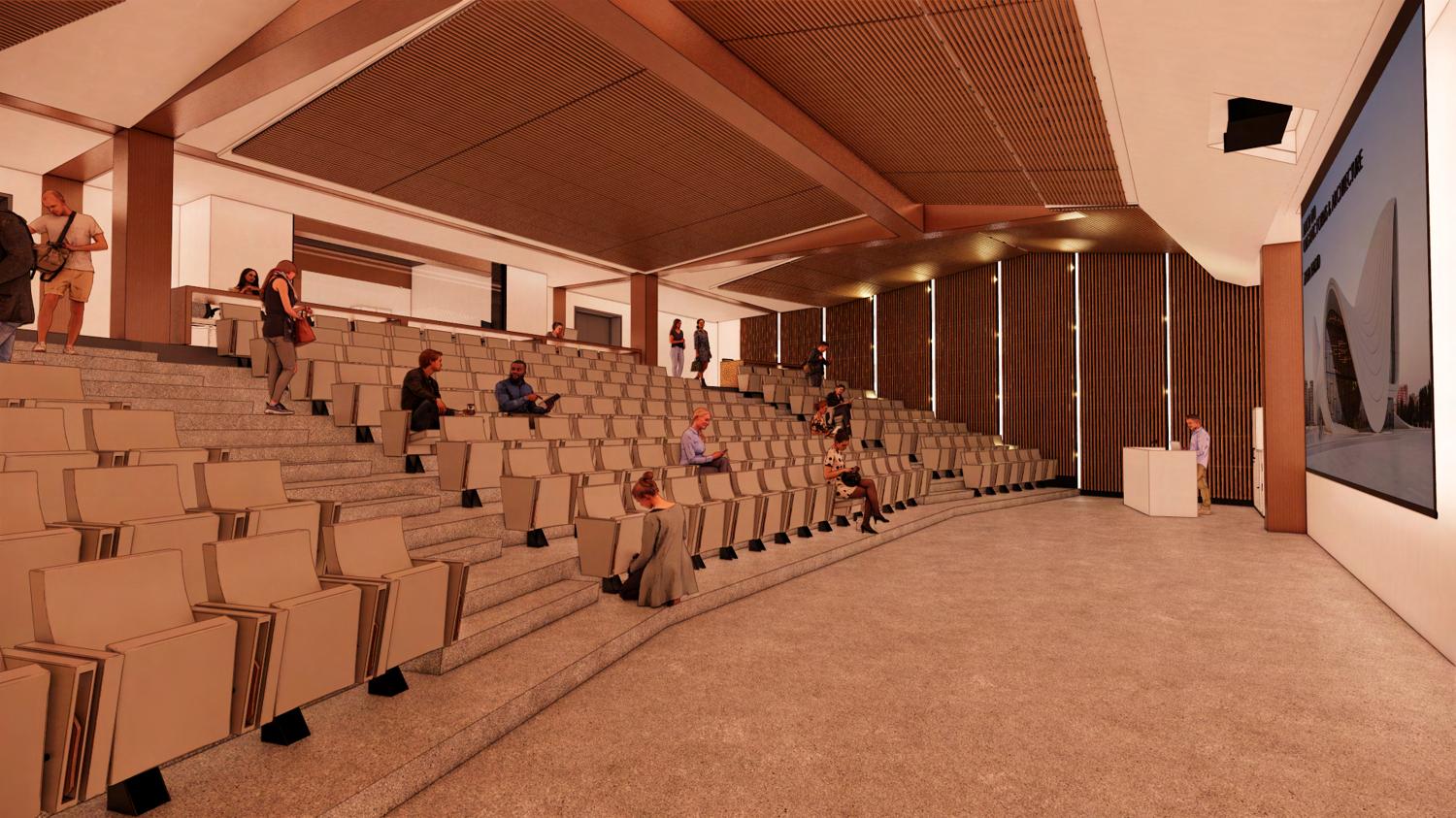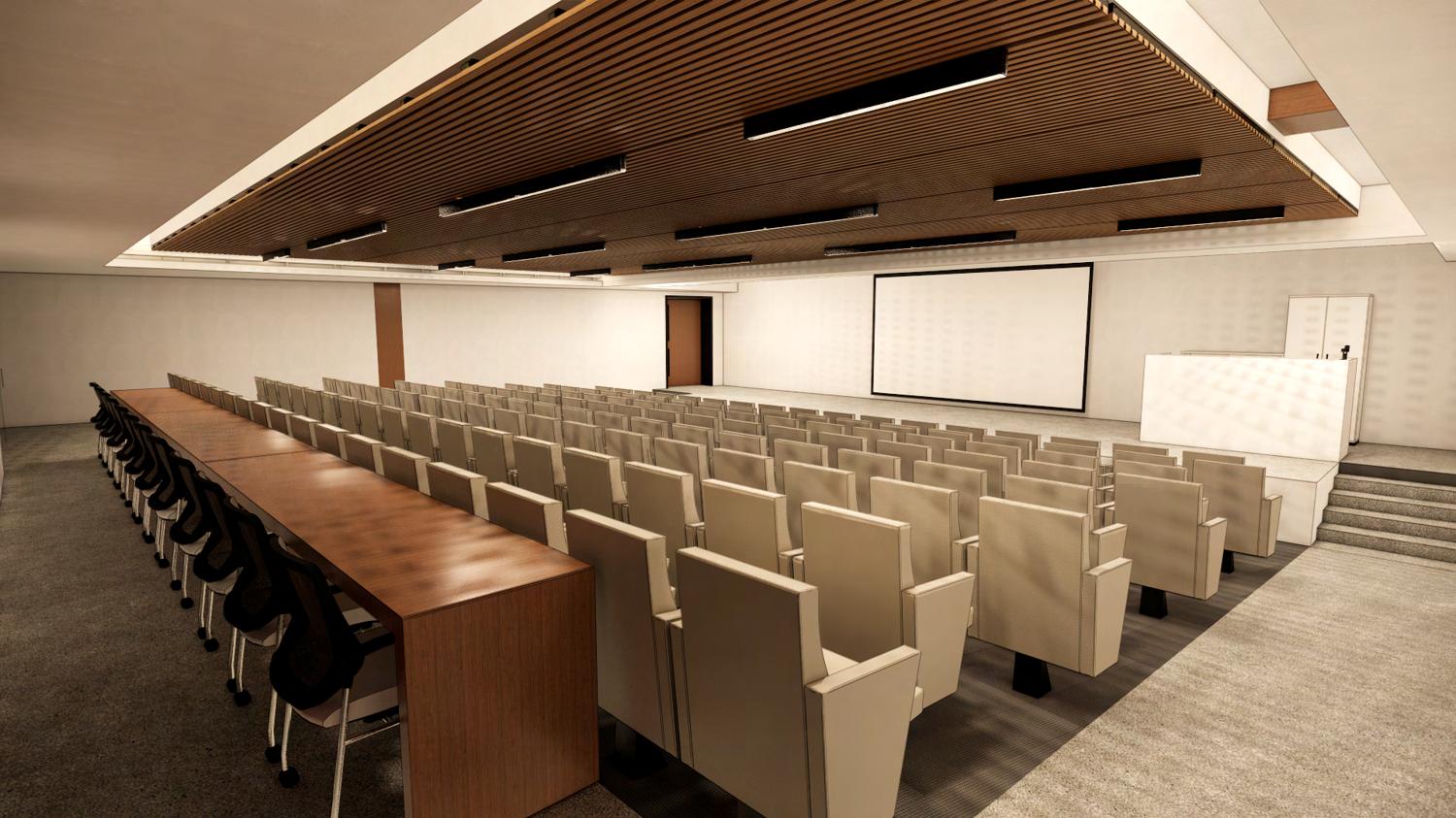 LOOKING OUT TOWARDS THE SEATING OF THE SMALLER LECTURE HALL ON BASEMENT LEVEL