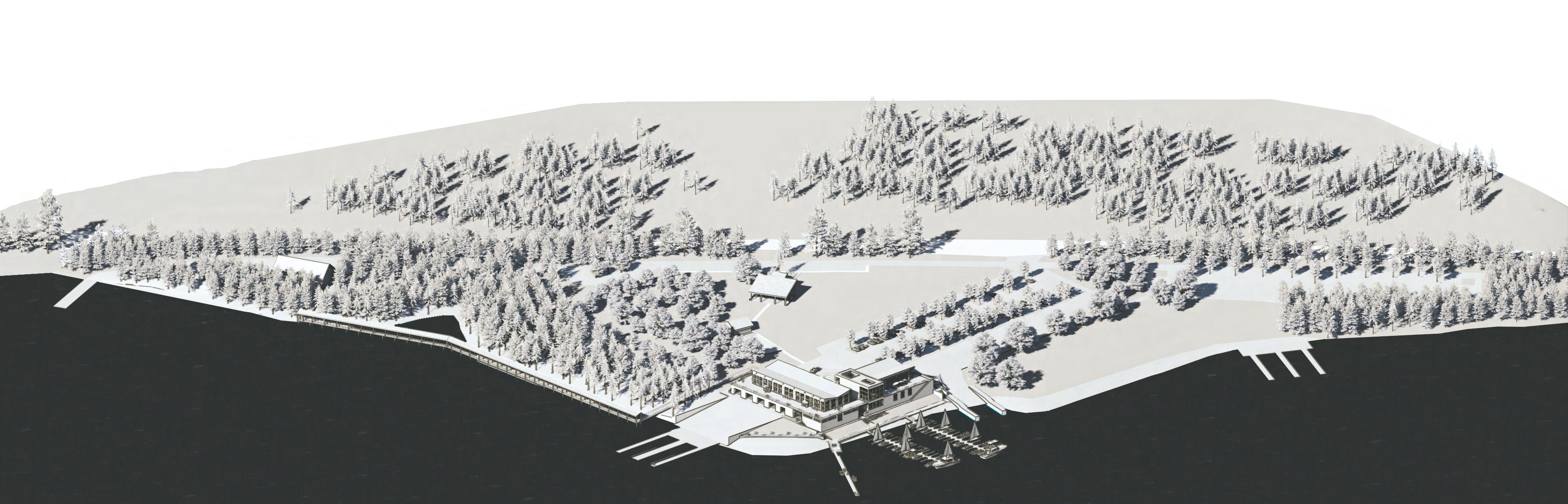 Located on the northern side of the Dexter Reservoir, the primary focus and intent of the new Rowing Center was to celebrate the surrounding natural beauty of the reservoir and landscapes, as well as the history of the rowing programs that have been at the reservoir for many years. At the beginning of this term, we toured the current facilities that the Univeristy of Oregon, OAR, and SERC rowing programs use. It quickly became a primary focus of my overall design scheme for the new center to not only be a major upgrade for the respective teams, but for it to also stand as a testament to all the hard work and dedication of all the rowers and coaches that have fought to better these three programs. What led to the proposed placement of the rowing center was based on a couple of factors. The major, primary focuses of the design was taking maximum advantage of the sweeping 180 degree views of the lake and surrounding forests and mountains from the corner spot that I chose. Another major consideration for the new center was placing it in an area of the site that had already been manipulated. It was a major goal of mine to limit as much as possible the amount of damage made to the site to build the new rowing center. Parking was also another major consideration, as regatta days at the lake lead to the vast majority of the spectators having to park on the street and walk along one of the busiest roads in Lowell was a major consideration when I focused on site improvements and making the park better overall.