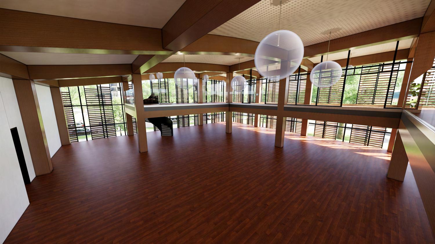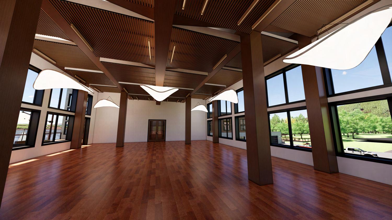 ELEVATED LOOK INTO THE EVENT HALL SPACE ON THE SECOND FLOOR