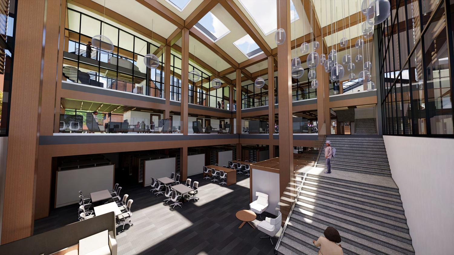 LOOKING TOWARDS MAIN LEVEL COLLABORATION SPACE AT FOOT OF GRAND STAIRCASE