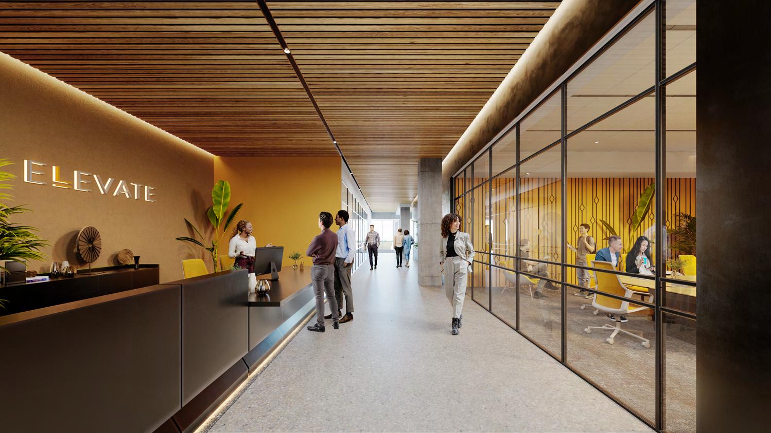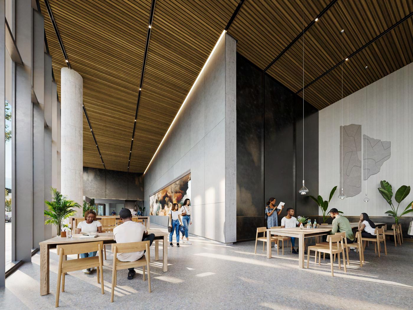As part of the interior architecture effort for this project, I helped coordinate and oversee the designing and creation of the public interior spaces that were part of this building’s amenity spaces. The first primary area of my project focus was the entry lobby that would also serve as the location of coffee shop/grab-n-go cafe space that was designed to be easily accessible from not just the interior but from the exterior as well. The way the team and I put together the design of the lobby was through the implementation of a high-end modern industrial aesthetic, using a combination of natural materials and finishes in the space. The pairing of the black steel wall cladding on the walls and the wood ceilings combined well with the cool grey concrete floors & columns. The cafe space and its layout and materials took precedent from the lobby space, with the primary light fixture over the cafe area finished in the same black steel finish as the wall panels. The major amenity spaces of the project were located up on the 3rd floor of the building, where 2 program functions were to be created along the perimeter of the building terrace. These 2 primary programs included a conferencing center and a fitness center. In the conference center, the program included 3 conferencing rooms, a social gathering space adjacent to the terrace, a caterer’s kitchen, and a front reception area. As for the fitness center, it included two locker rooms, an open-area fitness room, and a yoga studio.