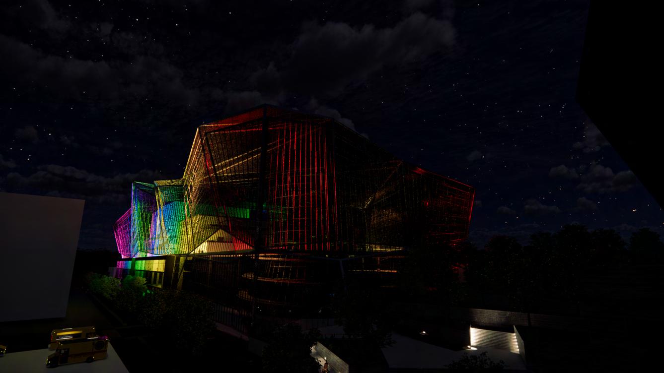 NE CORNER EXTERIOR AT NIGHTTIME WITH LED LIGHTING DISPLAY