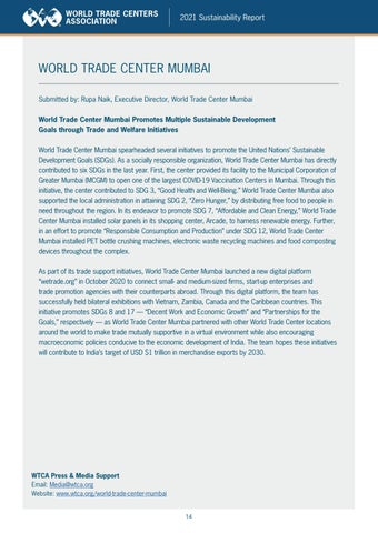 WORLD TRADE CENTER MUMBAI Submitted by: Rupa Naik, Executive Director, World Trade Center Mumbai World Trade Center Mumbai Promotes Multiple Sustainable Development Goals through Trade and Welfare Initiatives World Trade Center Mumbai spearheaded several initiatives to promote the United Nations’ Sustainable Development Goals (SDGs). As a socially responsible organization, World Trade Center Mumbai has directly contributed to six SDGs in the last year. First, the center provided its facility to the Municipal Corporation of Greater Mumbai (MCGM) to open one of the largest COVID-19 Vaccination Centers in Mumbai. Through this initiative, the center contributed to SDG 3, “Good Health and Well-Being.” World Trade Center Mumbai also supported the local administration in attaining SDG 2, “Zero Hunger,” by distributing free food to people in need throughout the region. In its endeavor to promote SDG 7, “Affordable and Clean Energy,” World Trade Center Mumbai installed solar panels in its shopping center, Arcade, to harness renewable energy. Further, in an effort to promote “Responsible Consumption and Production” under SDG 12, World Trade Center Mumbai installed PET bottle crushing machines, electronic waste recycling machines and food composting devices throughout the complex. As part of its trade support initiatives, World Trade Center Mumbai launched a new digital platform “wetrade.org” in October 2020 to connect small- and medium-sized firms, start-up enterprises and trade promotion agencies with their counterparts abroad. Through this digital platform, the team has successfully held bilateral exhibitions with Vietnam, Zambia, Canada and the Caribbean countries. This initiative promotes SDGs 8 and 17 — “Decent Work and Economic Growth” and “Partnerships for the Goals,” respectively — as World Trade Center Mumbai partnered with other World Trade Center locations around the world to make trade mutually supportive in a virtual environment while also encouraging macroeconomic policies conducive to the economic development of India. The team hopes these initiatives will contribute to India’s target of USD $1 trillion in merchandise exports by 2030.