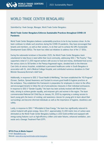 WORLD TRADE CENTER BENGALARU Submitted by: Vivek George, Manager, World Trade Center Bengaluru World Trade Center Bengaluru Enforces Sustainable Practices throughout COVID-19 Pandemic World Trade Center Bengaluru believes sustainability practices to be its key business driver. As the team continues to initiate such practices during the COVID-19 pandemic, they have encouraged their tenants and members, as well as their vendors, to do their part to achieve the UN’s Sustainable Development Goals (SDGs). The team has rolled out initiatives to address four of the 17 SDGs. During the nationwide lockdown in December 2020, the World Trade Center Bengaluru team volunteered to help those in need within their local community, addressing SDG 1 “No Poverty.” They supported a total of 11,000 migrant workers with access to food and money, distributed food across the various slums to 58 families in the Peenya Anganwadi region, donated beds to the Intensive Care Units at various hospitals, established a permanent healthcare center in South Bengaluru in association with St. John’s Medical College Hospital, and contributed numerous donations to Chief Minister Basavaraj Bommai’s relief fund. Additionally, in response to SDG 3 “Good Health & Well-Being,” the team established the “4S Program” (Screen, Sanitize, Spread Awareness and Sustain) to ensure good health & hygiene practices at the workplace. They established this framework in preparation for employees to return to the office and encouraged tenants to follow the set of precautionary measures in their individual workspaces. In response to SDG 5 “Gender Equality,” the team has been actively involved with World Vision India, striving to achieve gender equality, and empower girls and women in the region. The team commemorated National Girl Child Day on January 24, 2020 by organizing a cooking session to teach young girls the basics of cooking; and awareness classes for young girls to learn about their surroundings and become informed individuals as well as the importance of hygiene, cleanliness and safety. Lastly, in response to SDG 7 “Affordable & Clean Energy,” the team has significantly reduced its carbon footprint with green energy. Since 2017, approximately 21,000 metric tons of carbon were eliminated as the World Trade Center Bengaluru building is LEED Gold-certified and equipped with energy-saving features such as high-efficiency chillers and water fixtures, enhanced ventilation, zero waste and a Sewage Treatment Plant (STP).