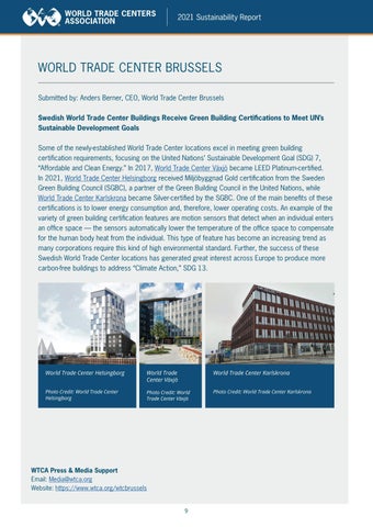 WORLD TRADE CENTER BRUSSELS Submitted by: Anders Berner, CEO, World Trade Center Brussels Swedish World Trade Center Buildings Receive Green Building Certifications to Meet UN’s Sustainable Development Goals Some of the newly-established World Trade Center locations excel in meeting green building certification requirements, focusing on the United Nations’ Sustainable Development Goal (SDG) 7, “Affordable and Clean Energy.” In 2017, World Trade Center Växjö became LEED Platinum-certified. In 2021, World Trade Center Helsingborg received Miljöbyggnad Gold certification from the Sweden Green Building Council (SGBC), a partner of the Green Building Council in the United Nations, while World Trade Center Karlskrona became Silver-certified by the SGBC. One of the main benefits of these certifications is to lower energy consumption and, therefore, lower operating costs. An example of the variety of green building certification features are motion sensors that detect when an individual enters an office space — the sensors automatically lower the temperature of the office space to compensate for the human body heat from the individual. This type of feature has become an increasing trend as many corporations require this kind of high environmental standard. Further, the success of these Swedish World Trade Center locations has generated great interest across Europe to produce more carbon-free buildings to address “Climate Action,” SDG 13.