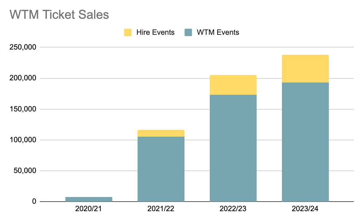 TRG Arts’ Benchmark data examined ticket and sales data of 129 theatres in the UK which showed a dramatic growth from the pandemic low of 2020 - demand has grown and more tickets are selling which is certainly true of WTM with a strong year on year growth in tickets sales.