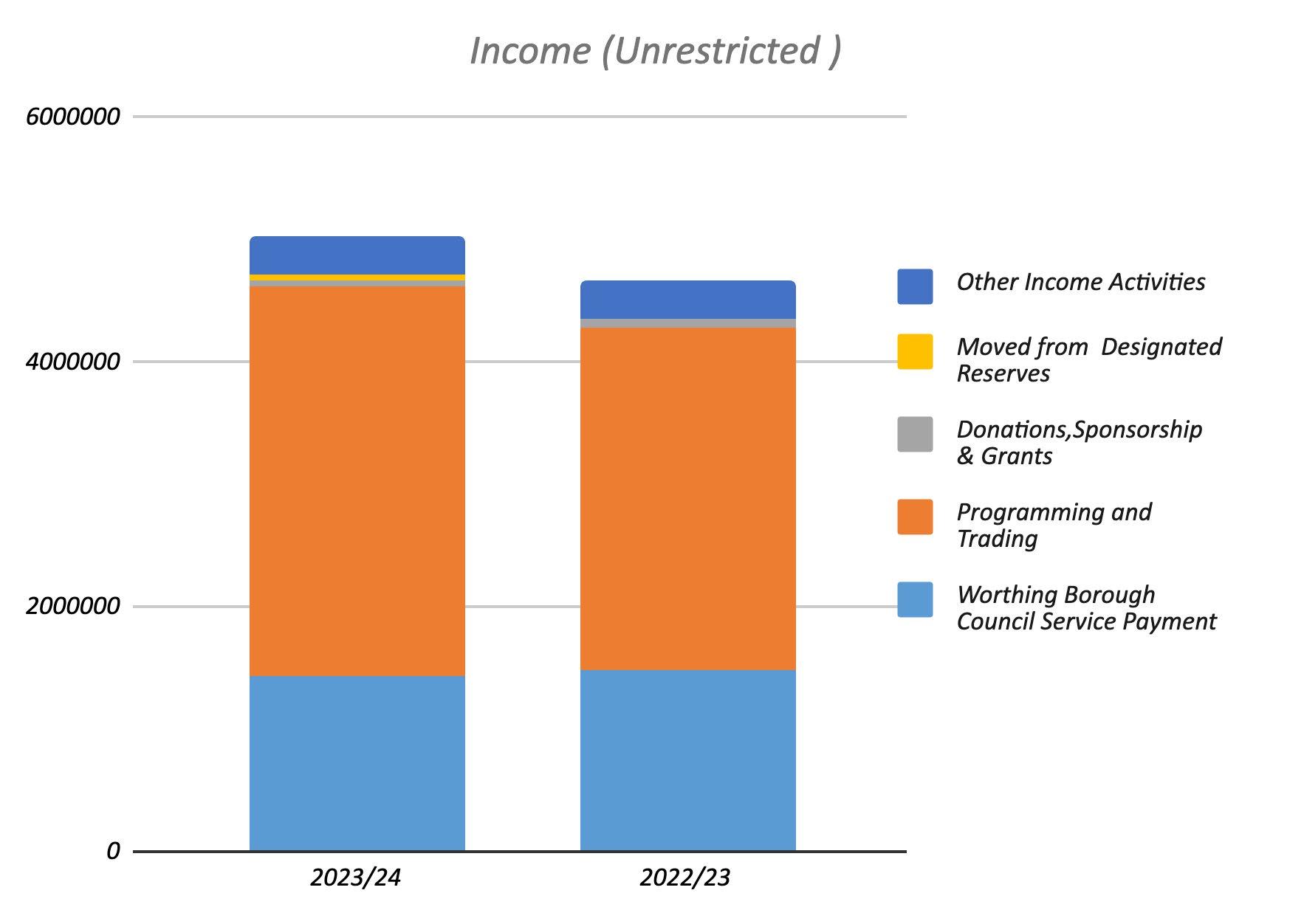 As budgeted, we used 100% of our ticket levy income received in the 2023/24 year for appropriate buildings, technical and creative costs; however from 2023/24 we are budgeting to put 50% of our ticket levy income into the Restoration Levy Fund, crucial when we have so much of our technical equipment reaching end of life. Our reserves remained largely unchanged at 31st March 2024.
