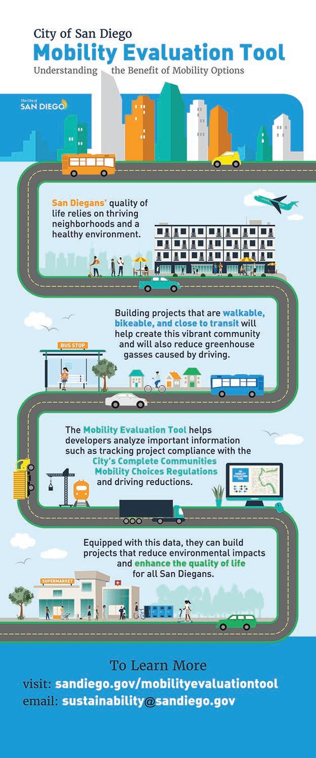 Under the strong leadership and vision of a talented group of local women, the SDMET helps ensure that new projects built in our communities are designed to provide mobility choices and support alternative modes of transportation Key contributors included policy leaders, visionaries, and technical experts from the City of San Diego (Heidi Vonblum, Alyssa Muto, Maureen Gardiner, Ann Gonsalves, Meghan Lithgow Liz Saidkhanian, and Sameera Rao), supported by the consultant team from Fehr & Peers and Byrne Communications (Katy Cole and Kristen Byrne). The team worked collaboratively to ensure the tool met the needs of various stakeholders including competing needs from various departments, and to guarantee accurate results that align with the City’s guidelines