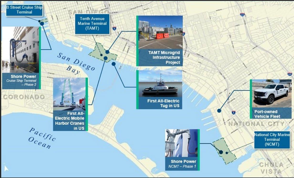 By 2030, the Port aims to achieve 100% zero emission (ZE) truck trips serving the Port, 100% ZE cargo handling equipment operating on the terminals, and a 100% ZE Port Fleet, far exceeding the California Air Resources Board requirements The Maritime Clean Air Strategy represents strategies that are focused on advancing transportation and infrastructure through technology. The Port successfully implemented initiatives such as the arrival of the first all-electric tugboat in the United States that will be fully powered by a shoreside battery energy storage system, adopting shore power for ocean-going vessels, incorporating the first two all-electric mobile harbor cranes in North America, and advancing zeroemission truck implementation The Port is working with Caltrans on the Harbor Drive 2 0 project to develop a multimodal corridor to improve signal prioritization for reduced truck idling, create specific transit lanes, and improve roadway conditions.