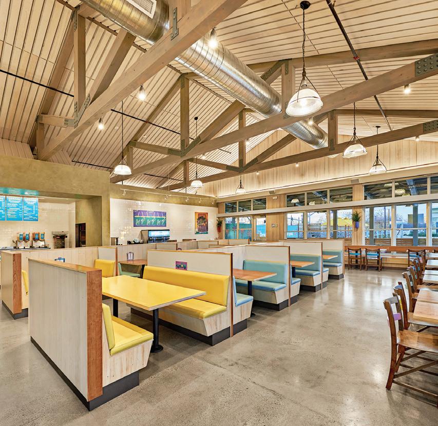 Equipped with four lanes, the eatery features large 2 feet x 5 feet high-definition digital reader boards manufactured from Watchfire, which aid in managing traffic for pre-orders, delivery drivers, and regular drive-thru visitors. The signage and architectural elements were designed and fabricated by Everbrite of Greenfield, Wisconsin.
