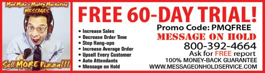 PIZZA INDUSTRY BULLETIN BOARD Need a hand spicing up your crust No problem, we’ve got the info you knead. Visit the Tom Lehmann Dough Information Center for the answers to all your dough formulation questions. From baker’s percentages to water content to flavor-infused doughs, the Dough Doctor provides the info that will have you raking in the dough! www.pmq.com/doughinformationcenter ? THE BEST HAND for your business Increase Upselling Reduce Hang-Ups We have your ACE of SPADES, Call Us Today! Enhance Image Track Results It’s Better Here 1-800-392-4664 www.messageonholdservice.com 24/7/365 Service We make your phone explode with business MysteryAutoAttendants Shopping CableInternetConnectivity andPhoneService WirelessVoIP,SDWAN Back-up APRIL 2020 | PMQ.COM 69