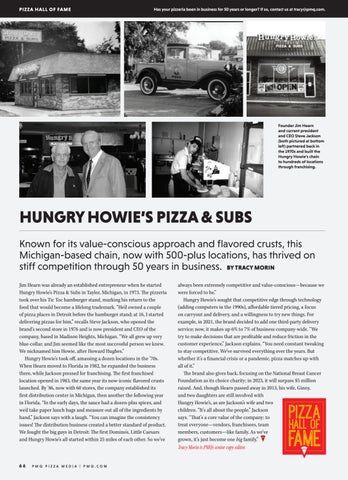 Jim Hearn was already an established entrepreneur when he started Hungry Howie’s Pizza & Subs in Taylor, Michigan, in 1973. The pizzeria took over his Tic Toc hamburger stand, marking his return to the food that would become a lifelong trademark. “He’d owned a couple of pizza places in Detroit before the hamburger stand; at 16, I started delivering pizzas for him,” recalls Steve Jackson, who opened the brand’s second store in 1976 and is now president and CEO of the company, based in Madison Heights, Michigan. “We all grew up very blue-collar, and Jim seemed like the most successful person we knew. We nicknamed him Howie, after Howard Hughes.”