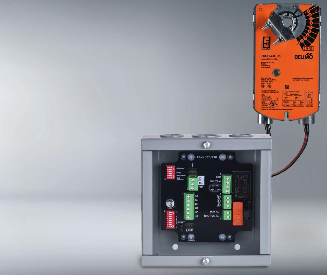 Belimo’s FSKN remote inspection module allows testing of actuated life safety dampers without the need for costly visual inspections and meets testing requirements of NFPA 80 and NFPA 105 referenced by the International Building Code (IBC). The module initiates damper cycling and verifies the damper position to ensure proper operation in emergencies. The FSKN connects seamlessly to Fire Alarm panels or Building Automation Systems using BACnet or Modbus communication protocols.