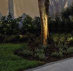 A resort has multiple luminaires by exterior doors, so if more than one was powered by the emergency system, total darkness would be prevented even if one failed. This photo highlights the architectural details of the façade, and also provides wayfinding for the property.
