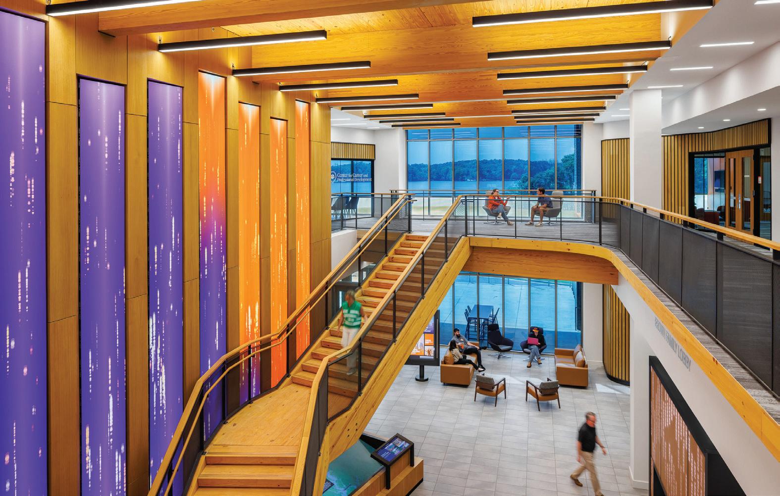 ence, so it needed to make an impression. Goodwyn Mills Cawood, in partnership with Cooper Carry, designed the Center with an exposed, cross-laminated timber core that stretches up through a double-height atrium in the main lobby to bring a sense of warmth to the arrival experience.