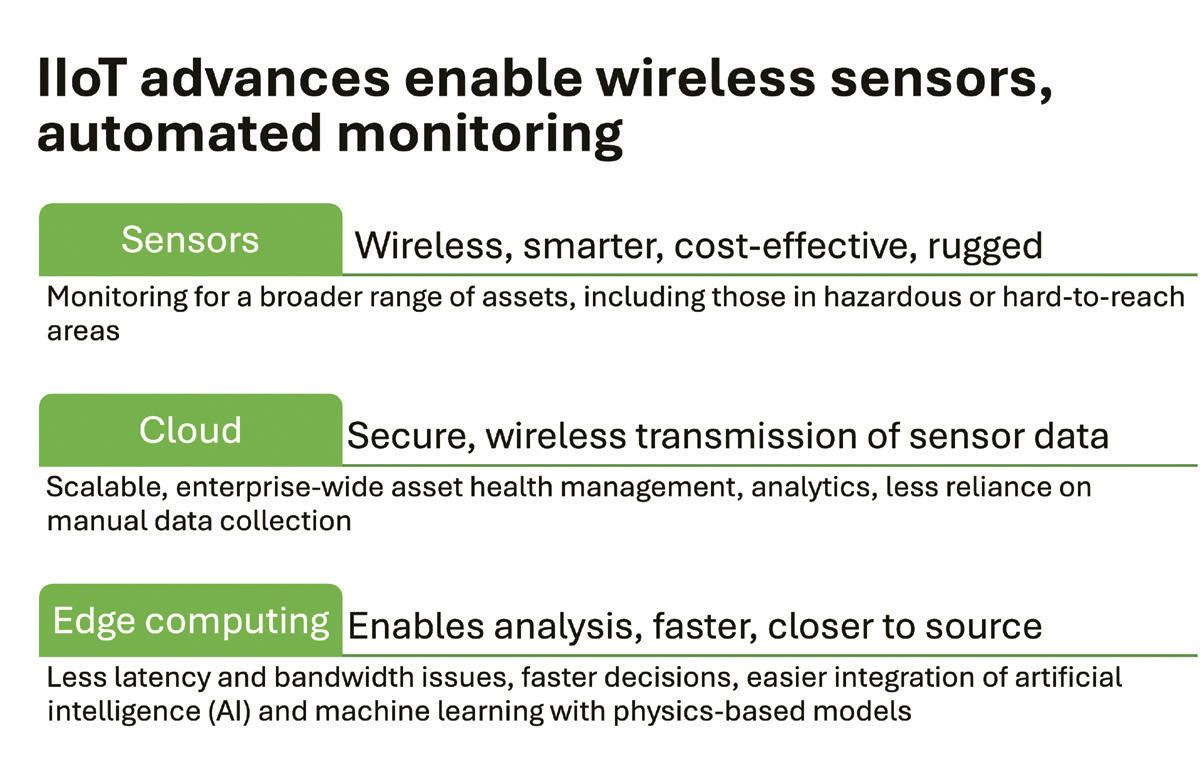 Roaldson: Advances in IIoT technology have transformed condition monitoring in industrial environments. Traditionally, only the most critical assets were monitored due to high costs and deployment challenges, leaving less critical assets to timebased or run-to-fail maintenance strategies. This often leads to unnecessary maintenance on healthy equipment or unplanned downtime and costly repairs due to unexpected failures. With IIoT, the landscape has shifted in several ways. For example, sensor deployment is now widespread. Sensors are now wireless, more intelligent, cost-effective and rugged, making it feasible to monitor a broader range of assets, including those in hazardous or hard-to-reach areas. Secure, wireless transmission of sensor data to the cloud, then enables scalable, enterprise-wide asset health management,