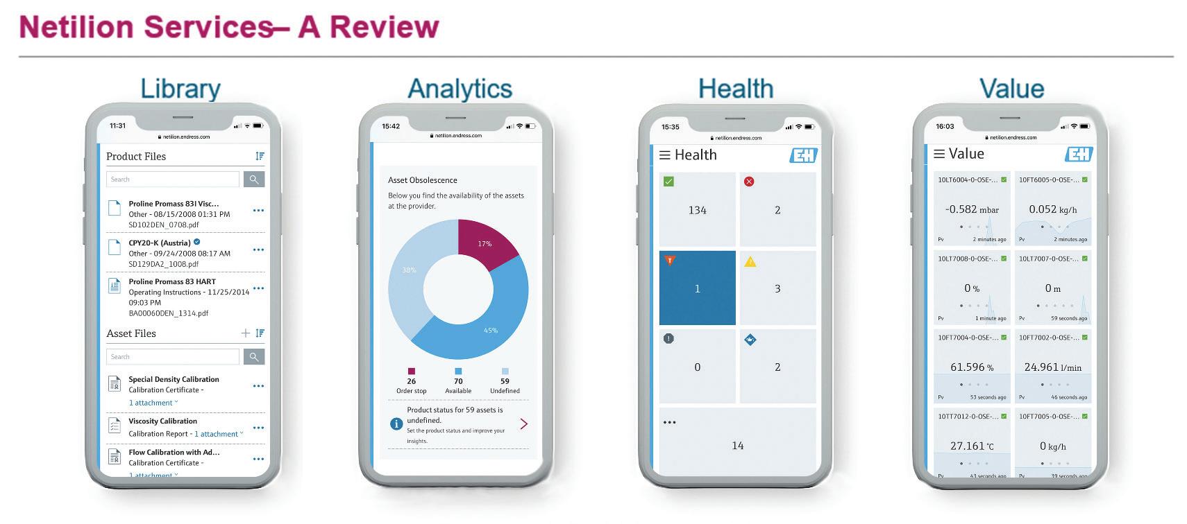 FIGURE 2: Endress+Hauser’s Netilion cloud suite includes accessible tools for device health monitoring, centralized documentation, predictive maintenance insights and performance analytics.